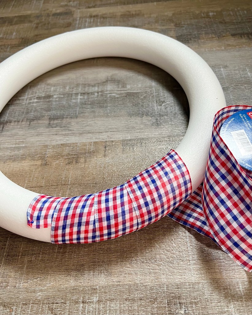 You’ll need a styrofoam wreath form (mine is 14-inches), some patriotic print ribbon, your choice of embellishments, and a few straight pins. I found all of my supplies at Hobby Lobby.