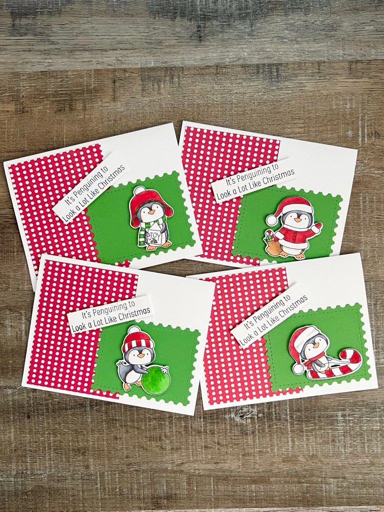 What is Christmas in July without Christmas cards? I made this month’s cards using the Penguining To Look A Lot Like Christmas stamp set from My Favorite Things Stamps. They also have a matching die set available so you can easily cut out the images.