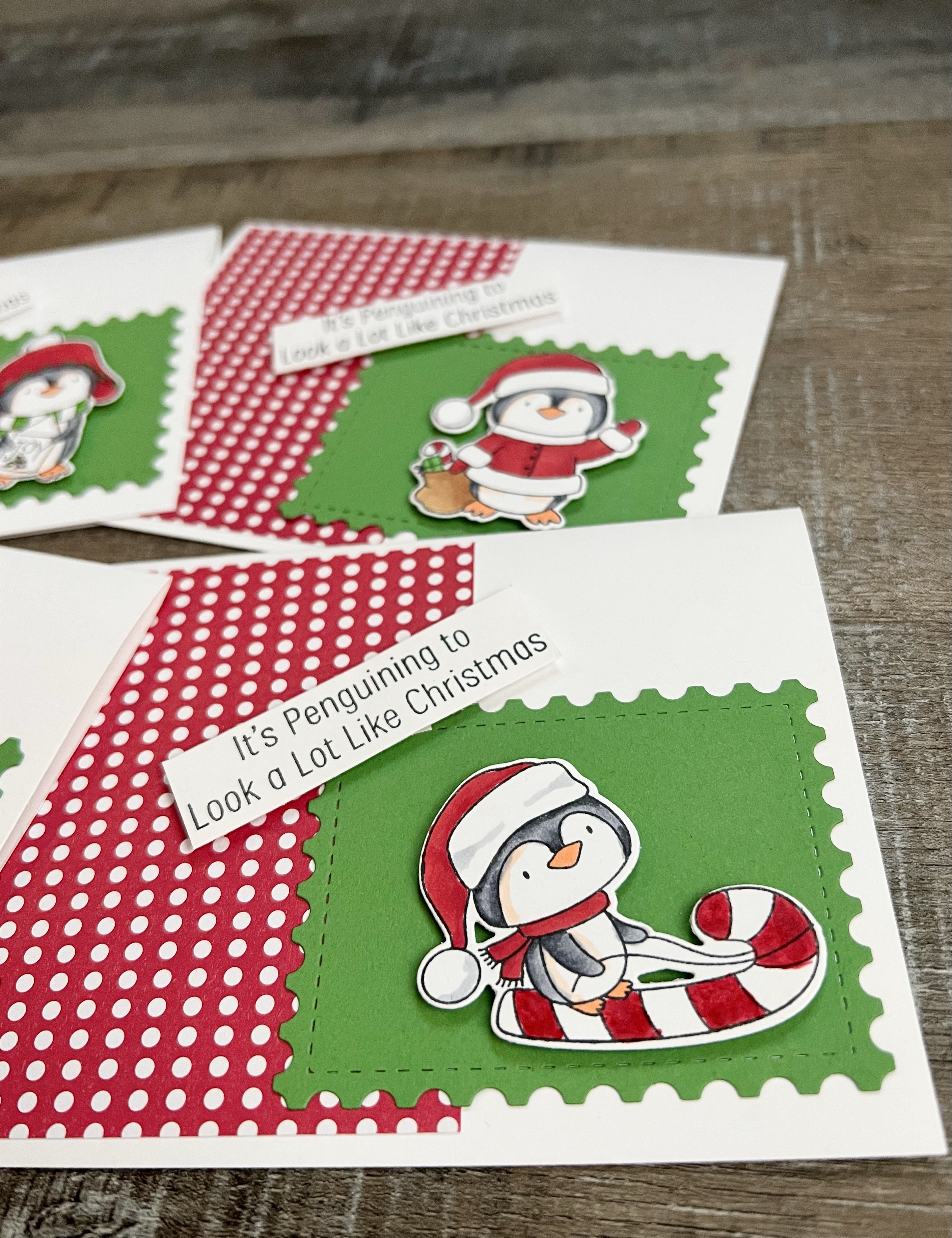 What is Christmas in July without Christmas cards? I made this month’s cards using the Penguining To Look A Lot Like Christmas stamp set from My Favorite Things Stamps. They also have a matching die set available so you can easily cut out the images.