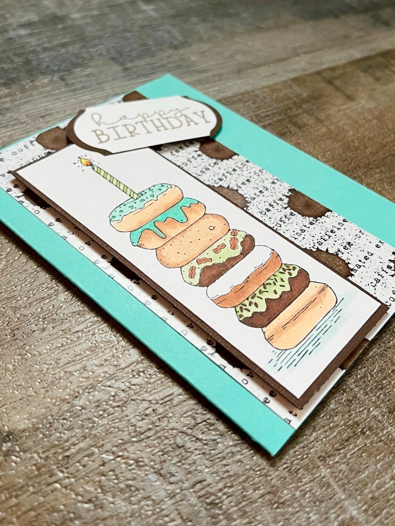 I stamped the donut stack with Memento Tuxedo Black ink on white card stock and colored it with Copic markers. Then I trimmed the image and layered it to brown card stock. I attached a piece of patterned paper (also from Unity Stamp Company) to a turquoise card. I attached the donut stack to the card using foam tape.