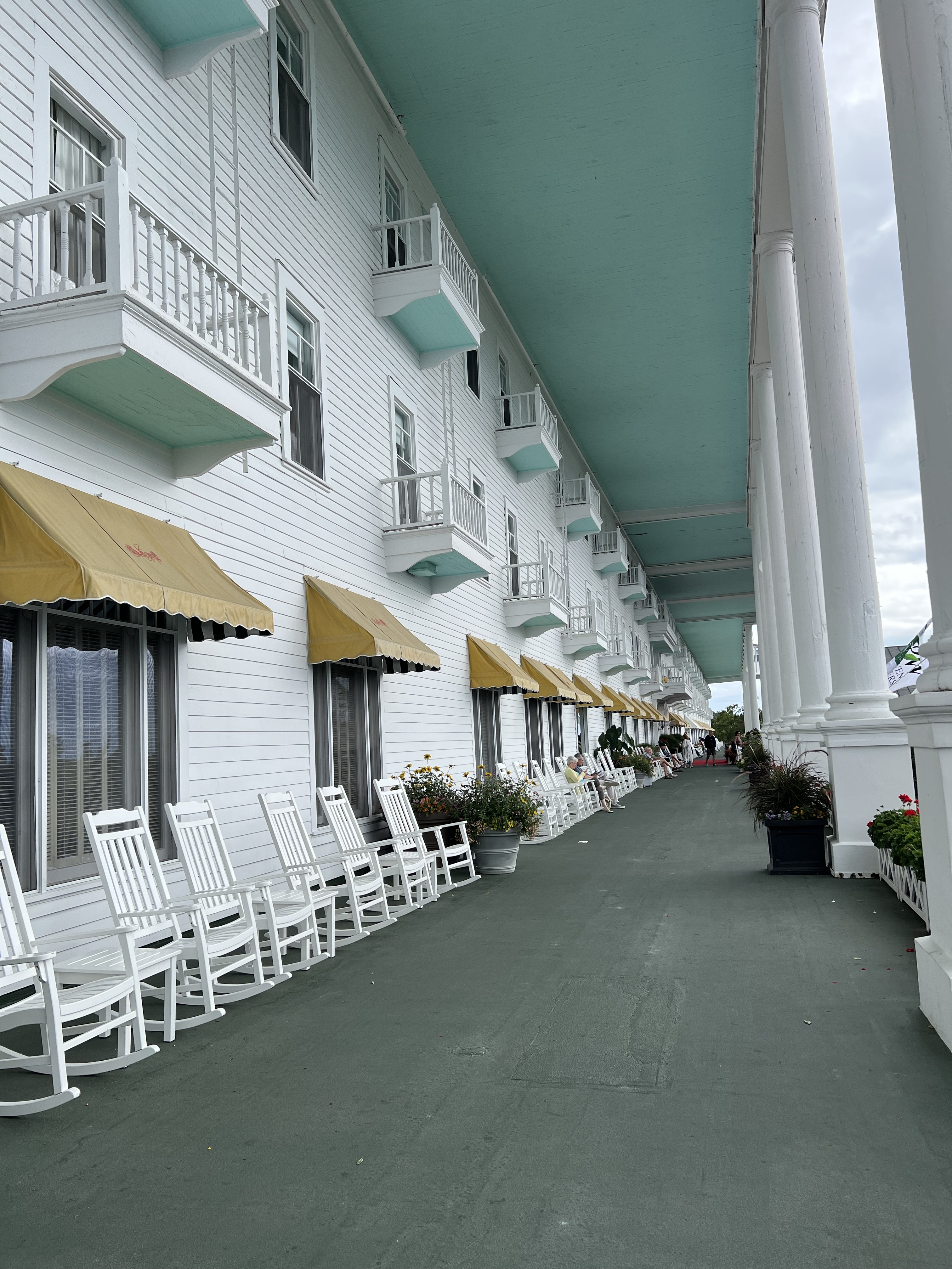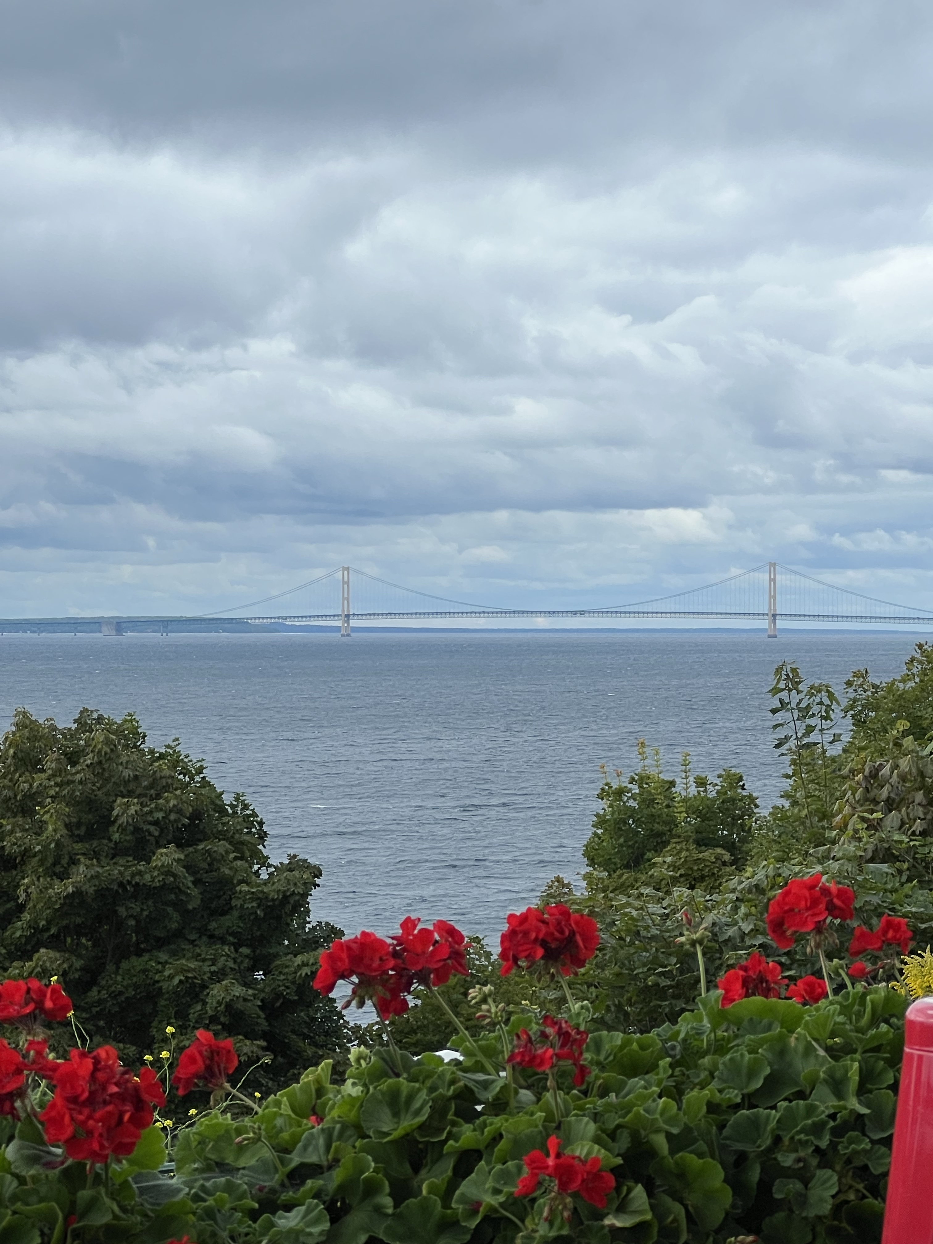 The porch of the Grand Hotel is the world’s largest at 660 feet long. It is lined with rocking chairs for relaxing, sipping a drink, and enjoying the views. The bridge in the photo below is the Mackinac Bridge as seen from the porch. The bridge connects the upper and lower peninsulas of Michigan and spans about 5 miles.
