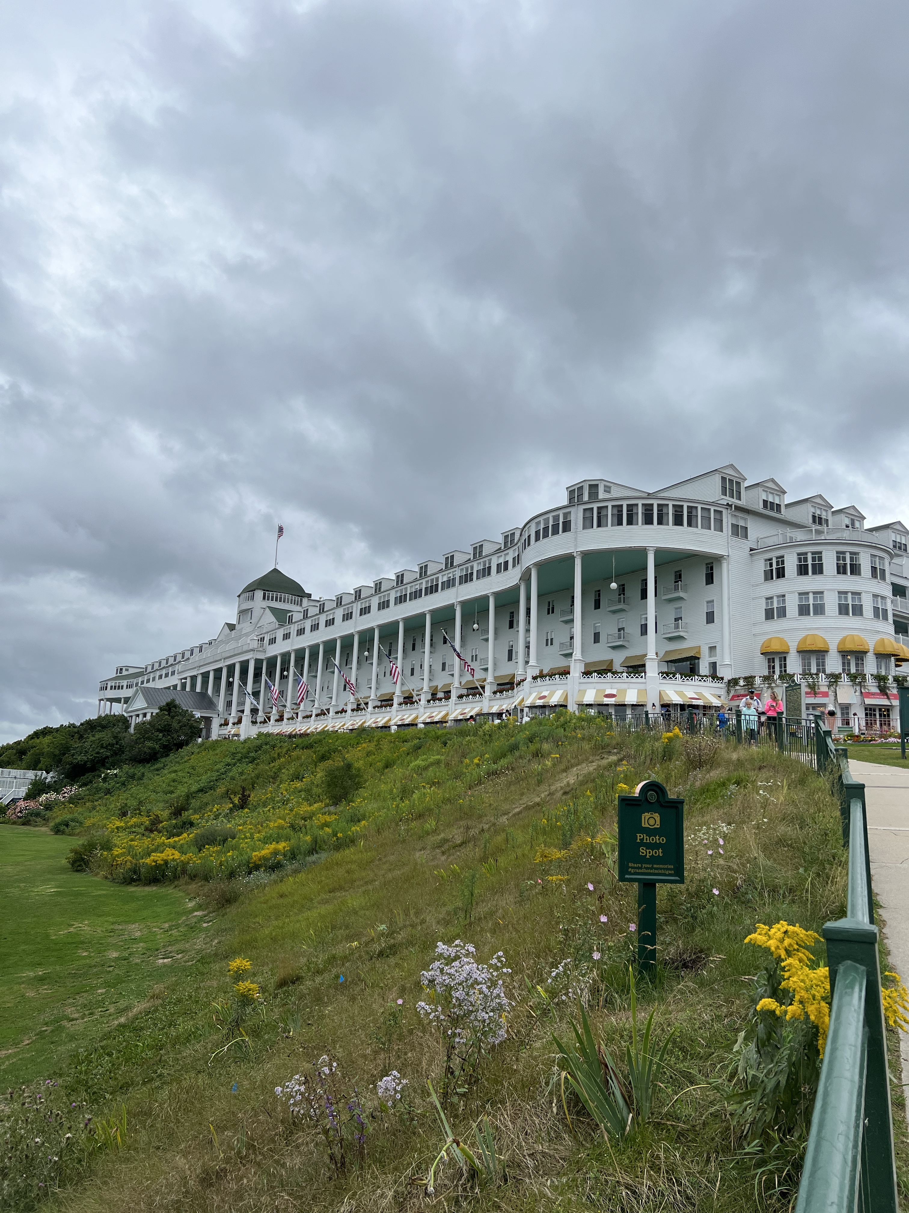 We hopped on the ferry in the morning to head over to Mackinac island. (And, yes, Mackinaw City is spelled differently but they are pronounced the same. 😊 You can read a little about that here.) As we neared the island, we were treated with a spectacular view of the Grand Hotel.
