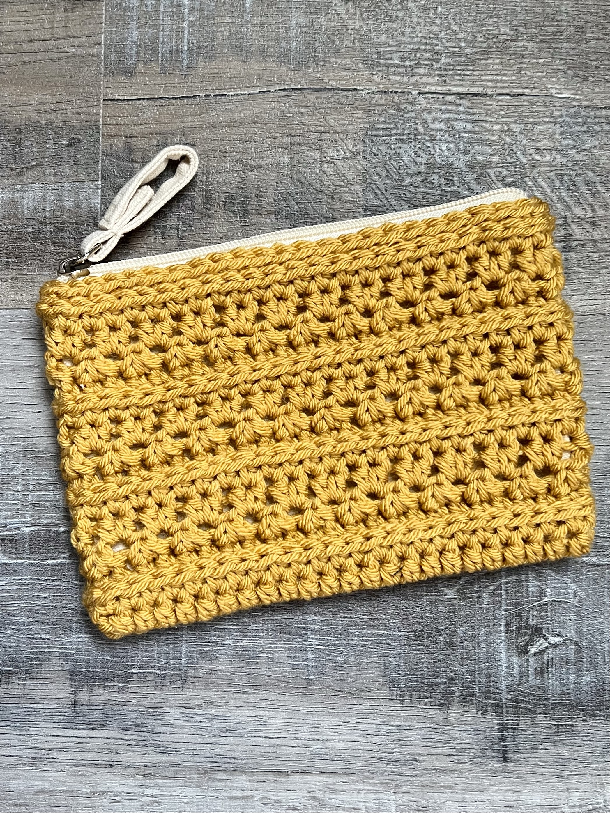 I used Yarn Bee Soft & Sleek yarn and an I/5.5mm hook to stitch up my pouch shells. The colors I used are Kale, Red, and Mustard. I found my zippered canvas bags at Hobby Lobby. They measure 4.75 by 6.75 inches and fit perfectly into the Shell Shocked Pouch Shells. And they are only 99 cents! 🙂