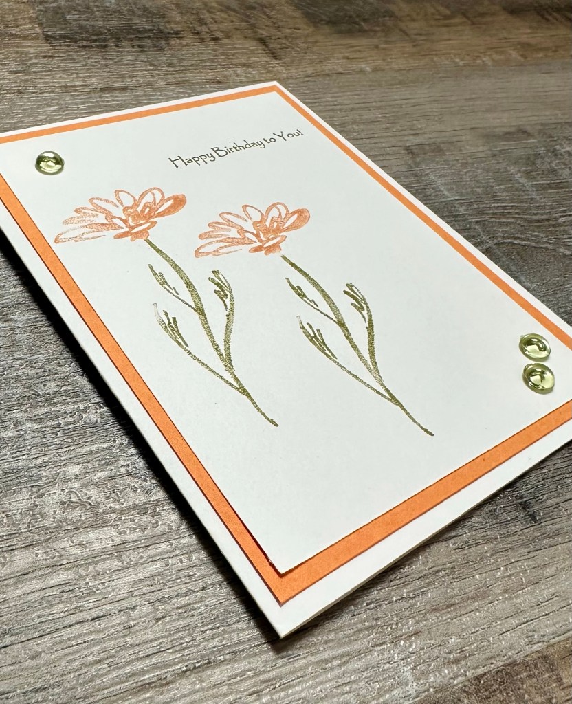 I stamped my flower twice on white card stock, re-inking the stamp before stamping each flower. I stamped my sentiment onto the card stock, using the same green marker to ink up my stamp. (I’ve had this birthday stamp in my craft room a long time 🙂 Use your favorite birthday sentiment stamp.) I layered the stamped panel to matching orange card stock and attached it to a white card. Then I added 3 green Dew Drops to finish the card.
