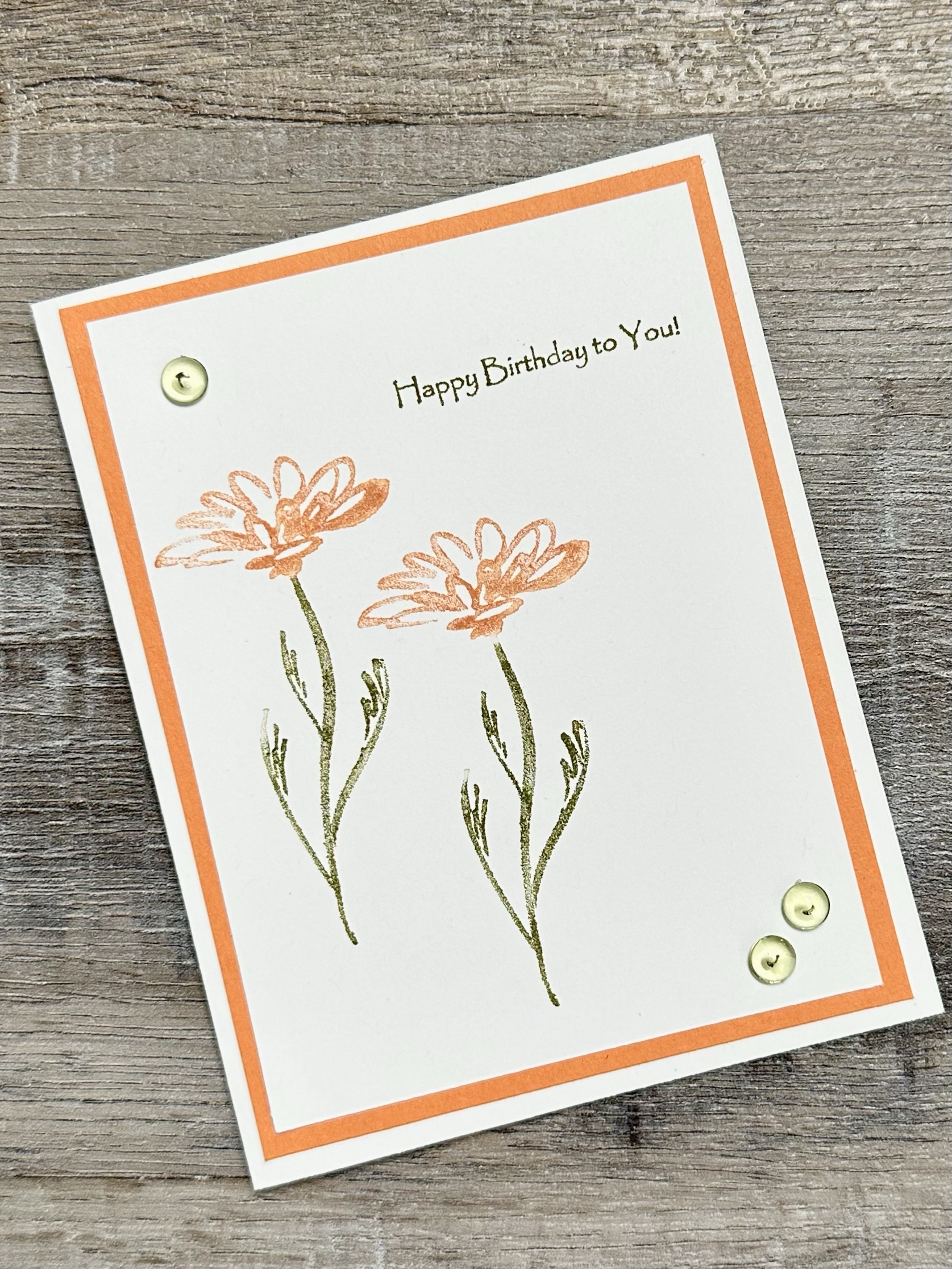 I stamped my flower twice on white card stock, re-inking the stamp before stamping each flower. I stamped my sentiment onto the card stock, using the same green marker to ink up my stamp. (I’ve had this birthday stamp in my craft room a long time 🙂 Use your favorite birthday sentiment stamp.) I layered the stamped panel to matching orange card stock and attached it to a white card. Then I added 3 green Dew Drops to finish the card.