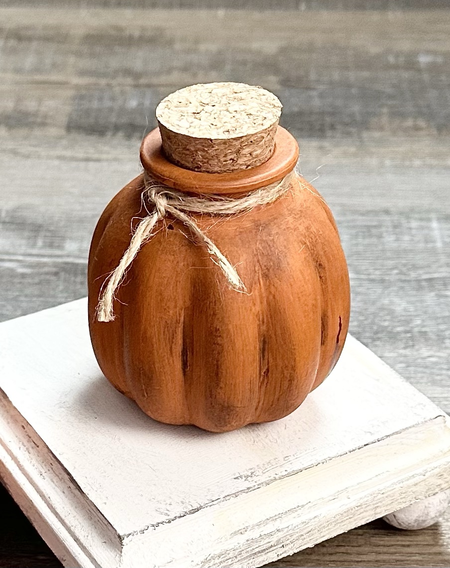 First I removed the cork, then washed and thoroughly dried the jars. I applied 3 coats of orange chalk paint (this is similar to what I used) with a foam brush, making sure to let it dry between coats. Then I applied a thin coat of antique wax and wiped the excess off with a paper towel. This step helps the texture of the jar to show up. To finish off my pumpkins, I tied some natural jute twine around the top and popped the cork back in.