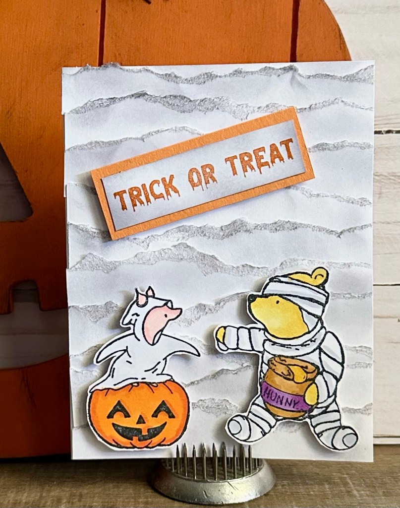 I wanted to mimic the mummy costume Pooh is wearing for my background. I tore strips of white card stock and applied dark gray ink to the edges using the Blender Brushes from Taylored Expressions. I attached the strips to a white card, overlapping them.