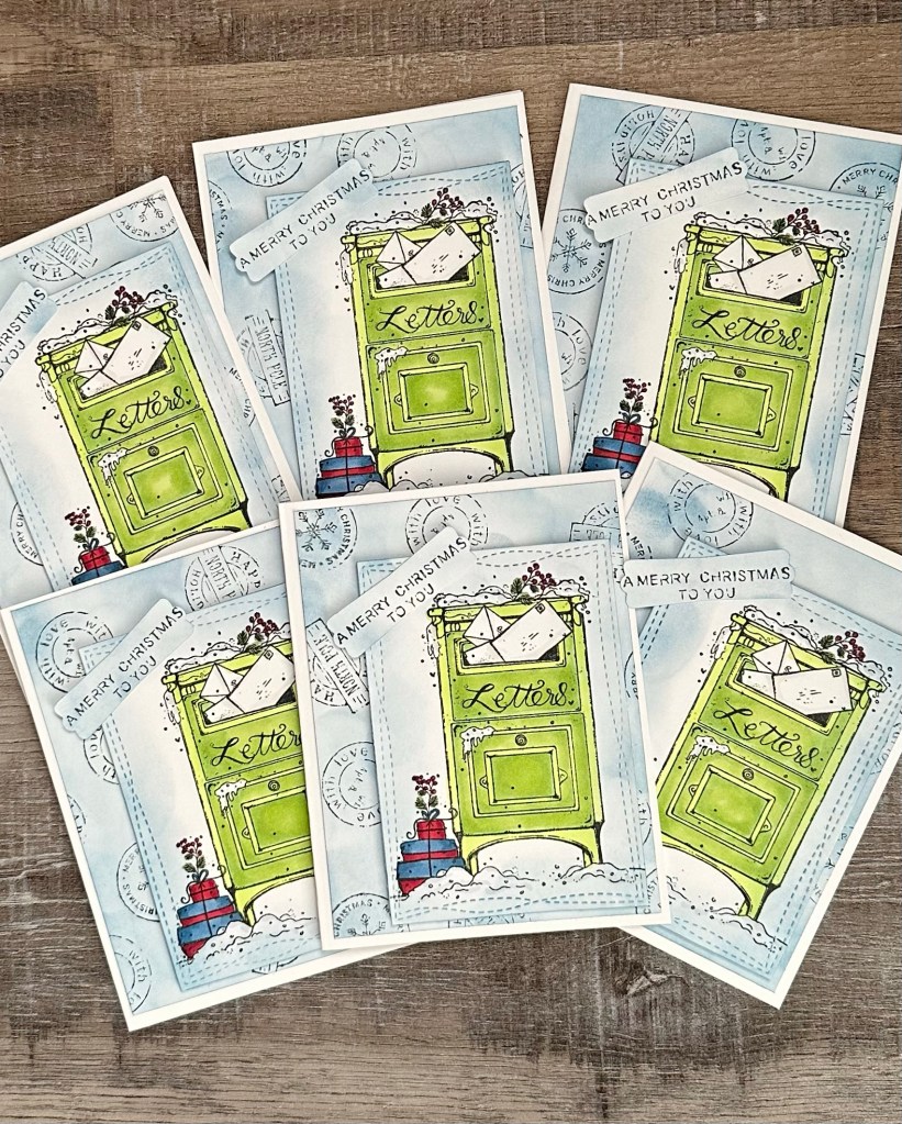 I used the Making Spirits Bright and Christmas Express stamp sets from Unity Stamp Company for this month’s card. I love the vintage look mailbox! We had one on the corner across the street from the house I grew up in (although it was blue 😉). I used to love mailing things for my mom when I was little. 🙂