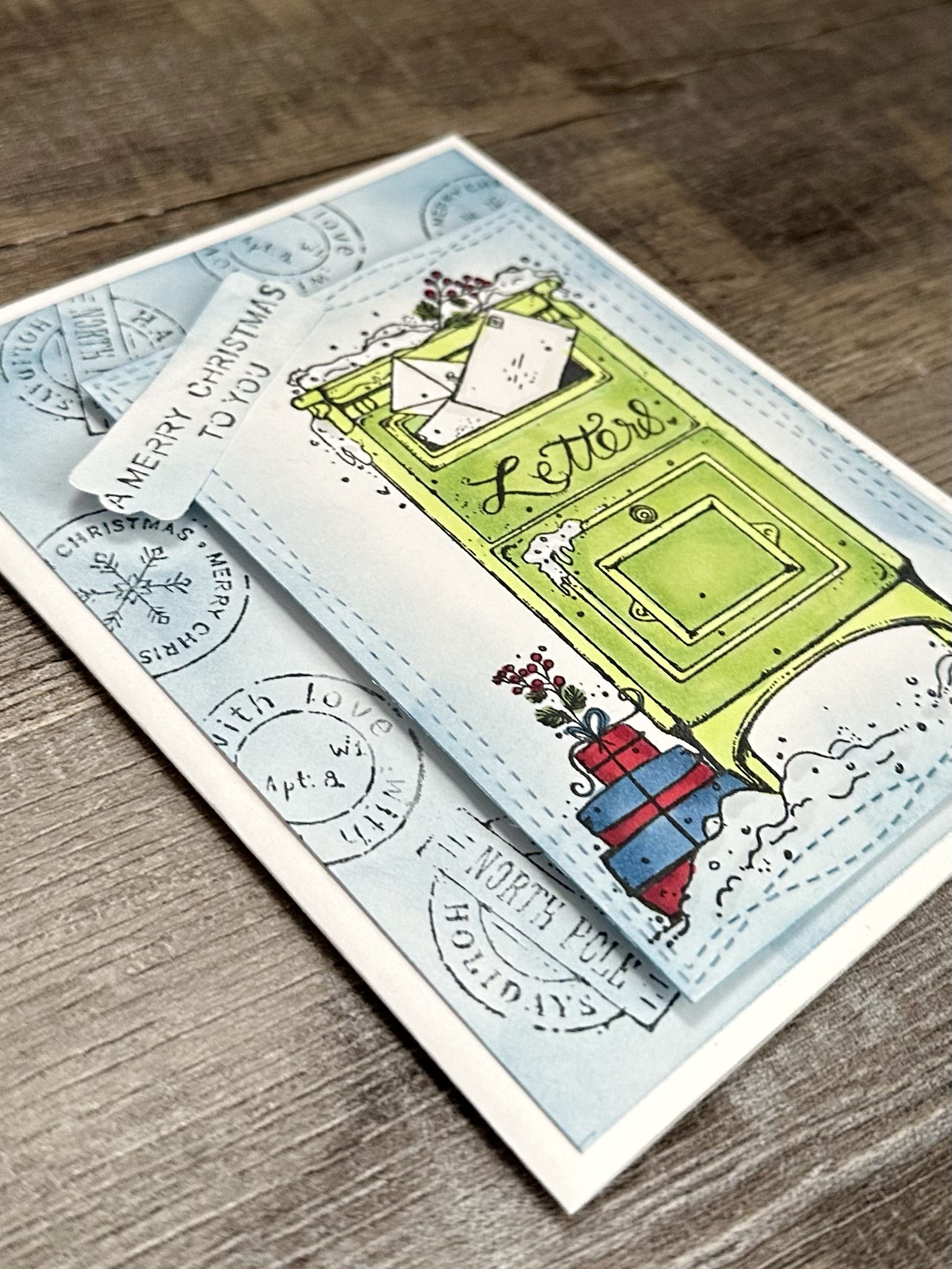I randomly stamped 3 of the postmark images from the Christmas Express stamp set on white card stock. I added blue ink with a Blender Brush and attached the piece to a white card. I attached the mailbox image to the card with foam tape. I stamped the sentiment with black ink on white card stock, punched it with a label punch (my punch is discontinued, but here is a set of similar dies), and applied blue ink. I attached it to the corner of the mailbox image.