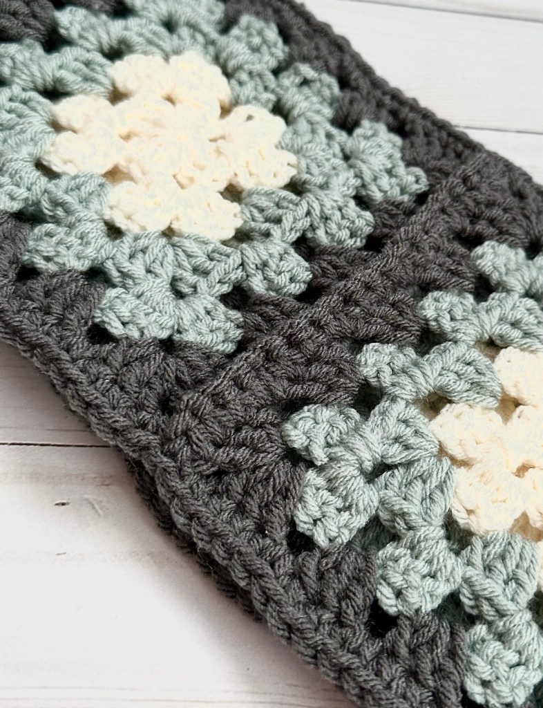 I used Yarn Bee Soft & Sleek yarn in Ivory, Viridescent, and Dark Gray with an H/5mm crochet hook to stitch up my granny squares. I started my square with 2 rows of Ivory, then I stitched 2 rows of Viridescent, and finished it with one row of Dark Gray. I made a total of 6 squares. My squares measured about 5.5 inches.