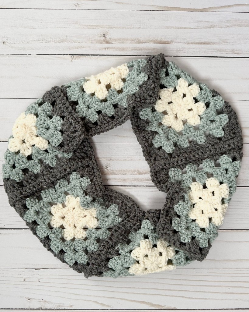The Crochet Granny Square Cowl is super easy to make and works up quickly! If you want it to be longer, simply add more squares. And your color choices are endless! Crochet cowls make great gifts, too. 😊