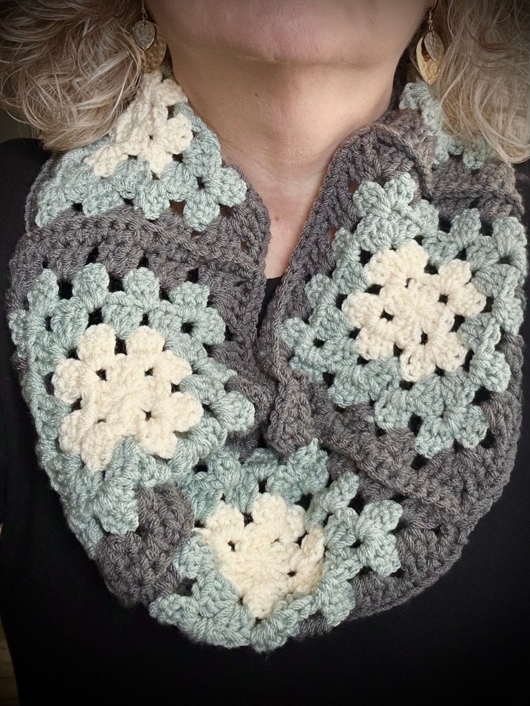 Granny Squares are everywhere right now! There are blankets, bags, sweaters, scarves…all kinds of pretty patterns and projects! I thought it might be fun to make a simple cowl using a basic granny square pattern and I love the way it turned out. 😊
