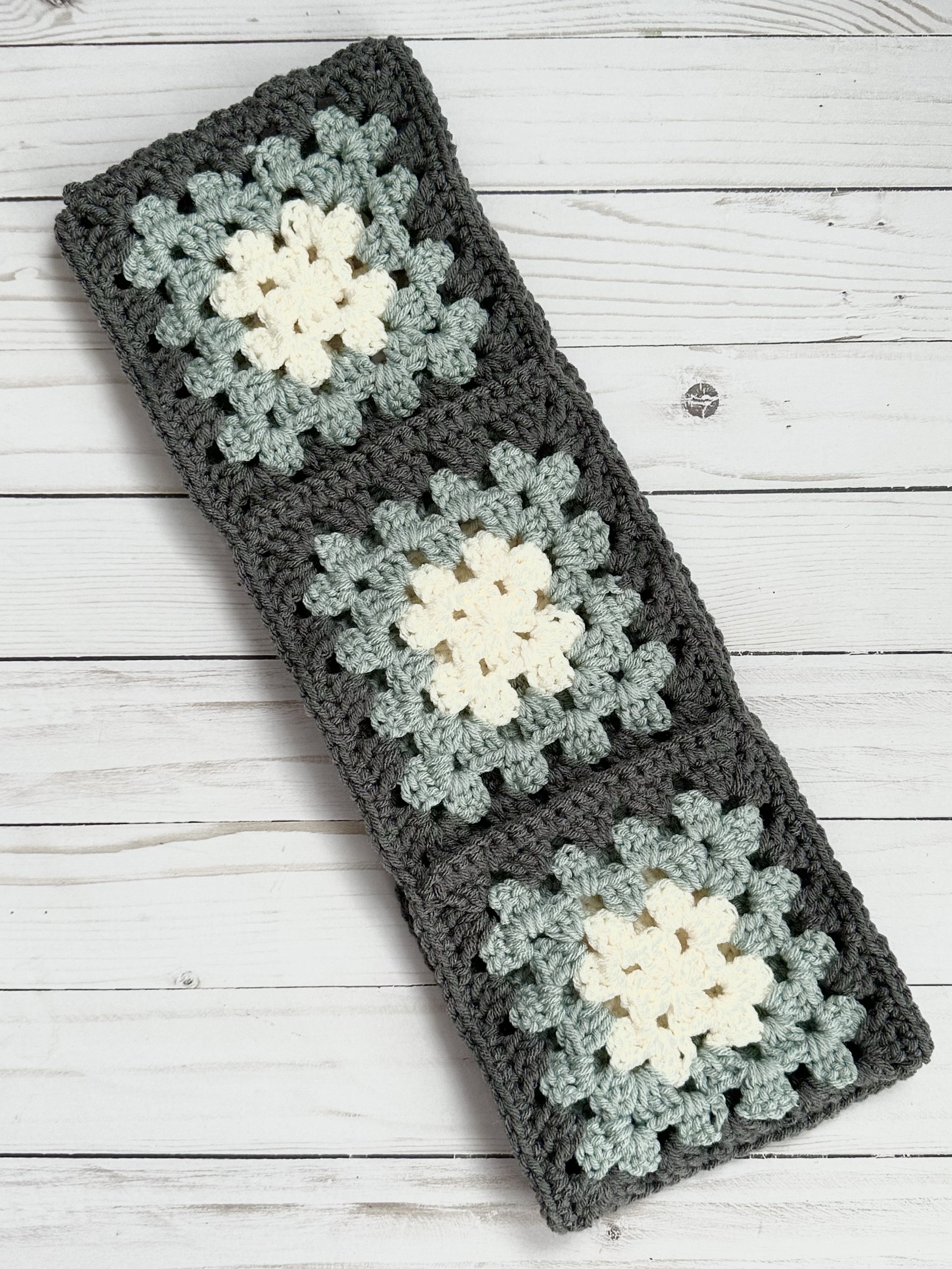 I used Yarn Bee Soft & Sleek yarn in Ivory, Viridescent, and Dark Gray with an H/5mm crochet hook to stitch up my granny squares. I started my square with 2 rows of Ivory, then I stitched 2 rows of Viridescent, and finished it with one row of Dark Gray. I made a total of 6 squares. My squares measured about 5.5 inches.