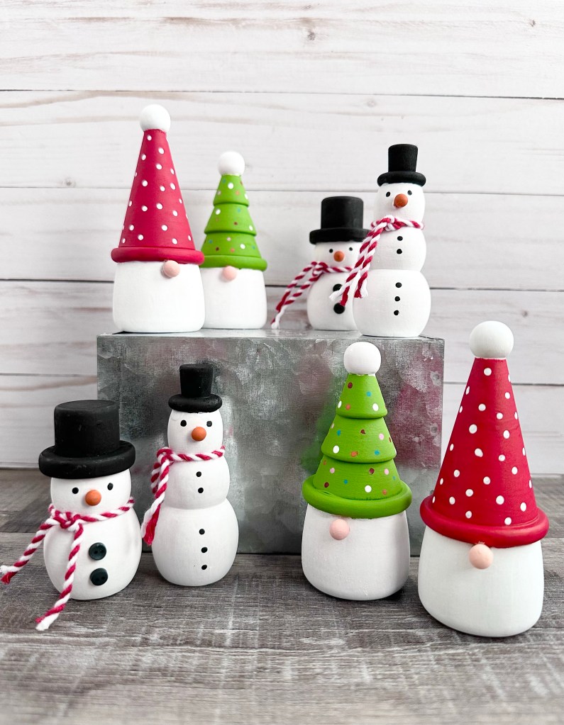 I used the round end of a small paintbrush handle to add the dots of color on the gnomes and the eyes and buttons on the snowmen. On the shorter snowman, I glued tiny real buttons on his little belly. Then I tied thicker red and white twine onto the snowmen for their scarves. (You can also use thin ribbon.)