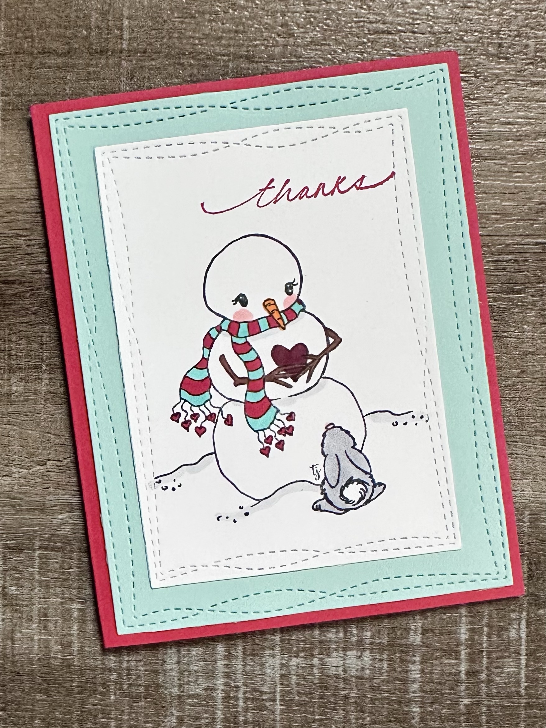 I stamped “thanks” in red ink on the snowman piece and layered it to the light turquoise card stock. Then the entire piece is attached to a red card. My “thanks” stamp is one I’ve had forever and it’s no longer available. ☹️ Use your favorite thank you stamp or this one would be really cute, too. ❤️