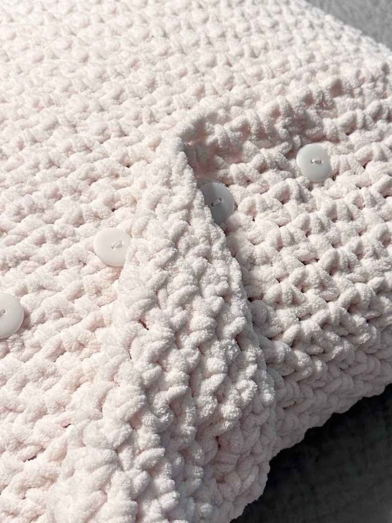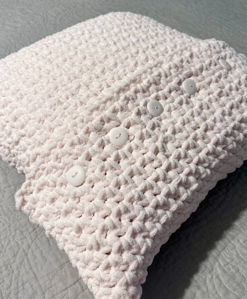 I used Bernat Blanket yarn in Whipped Cream and an N/10mm crochet hook to stitch up my pillow cover. Depending on the lighting, this color can have just a hint of blush to it – it’s so pretty!
