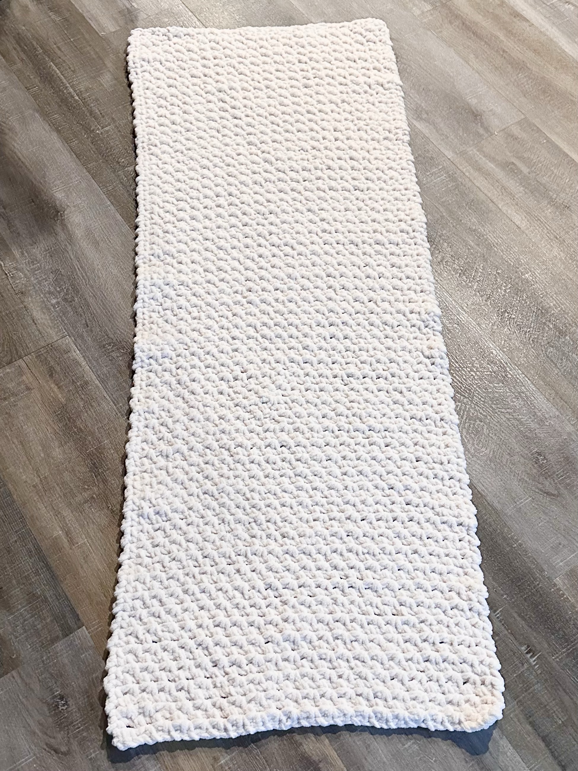 Repeat Row 2 and 3 until your rectangle wraps around your pillow insert with an extra few inches to make the flap that you will fold over. For my pillow, my flap measures about 9 inches. If your pillow insert is smaller, you will probably want your flap to be smaller. My rectangle measures approximately 50 inches long by 20 inches wide.