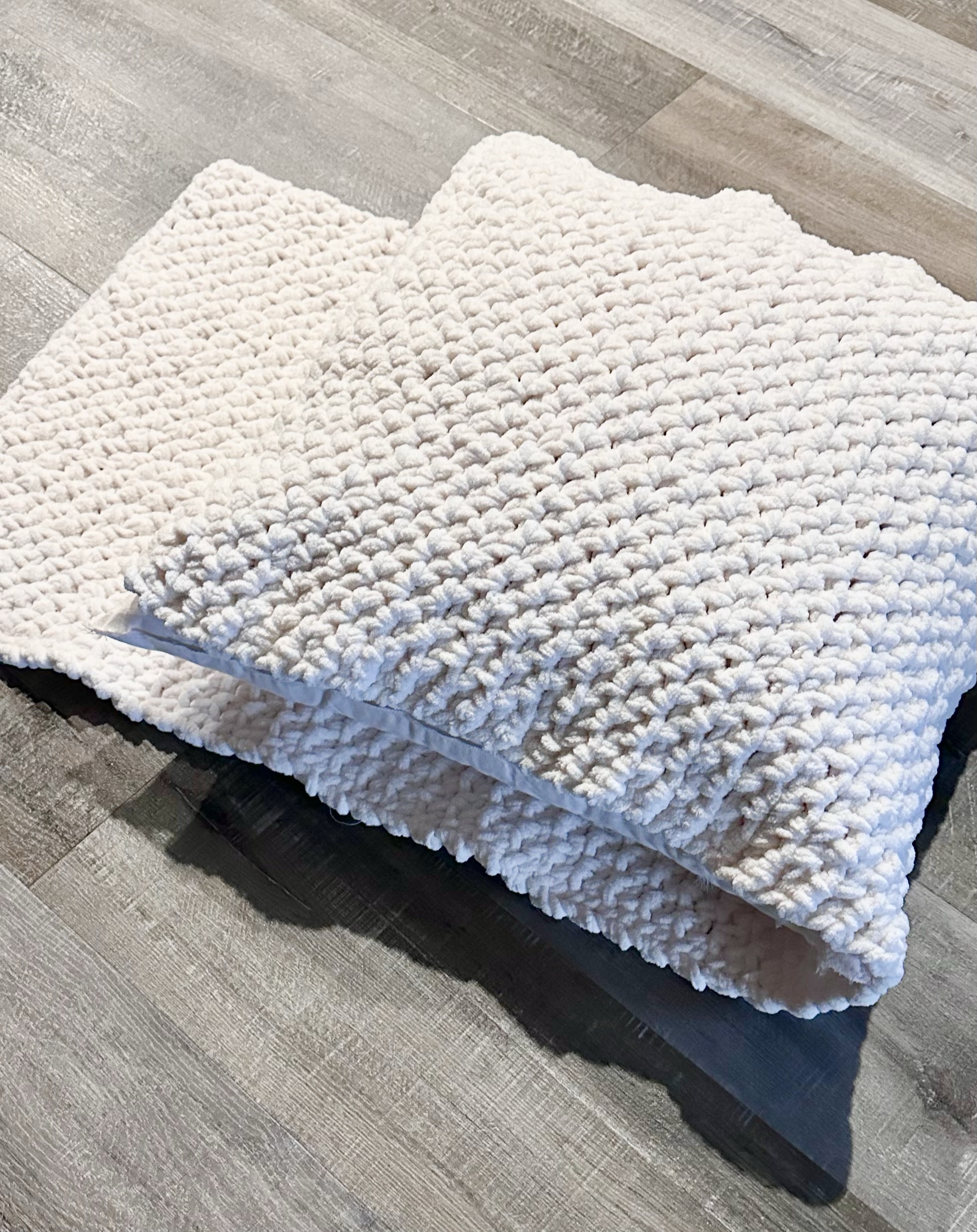 I used Bernat Blanket yarn in Whipped Cream and an N/10mm crochet hook to stitch up my pillow cover. Depending on the lighting, this color can have just a hint of blush to it – it’s so pretty!