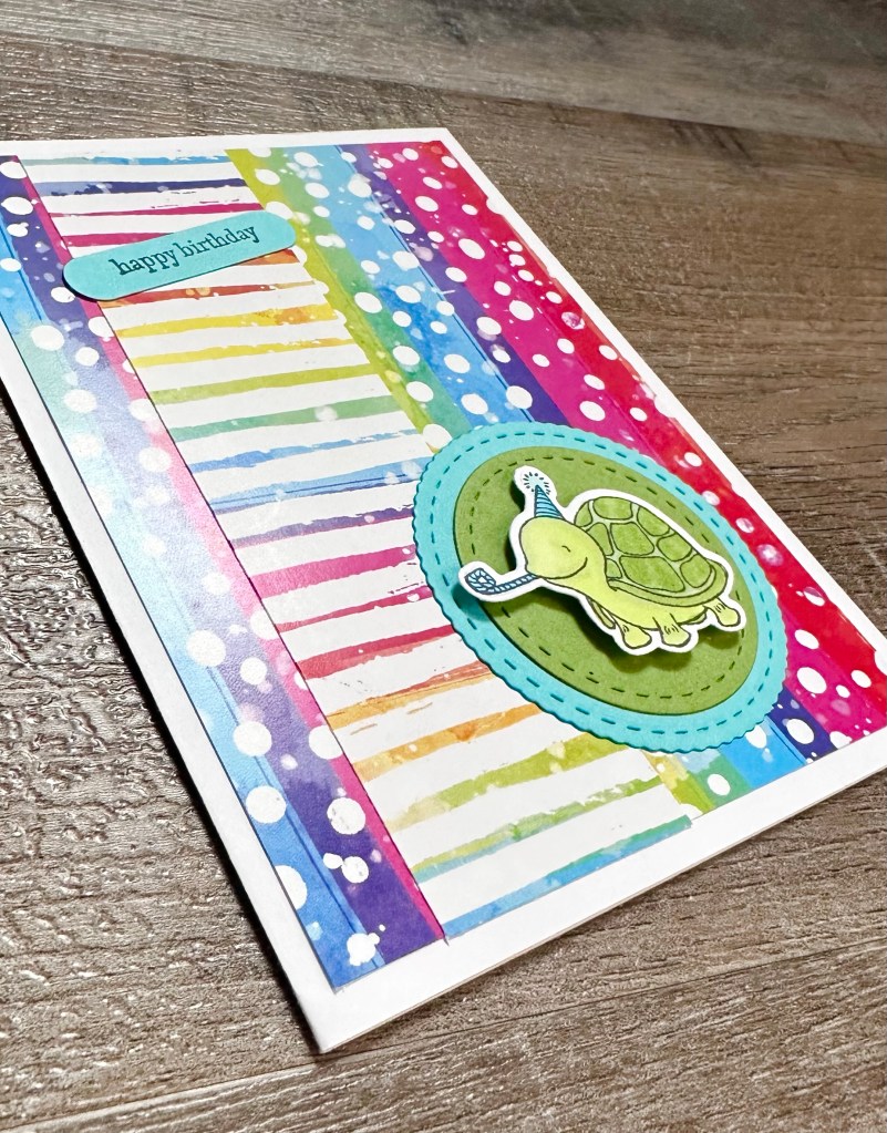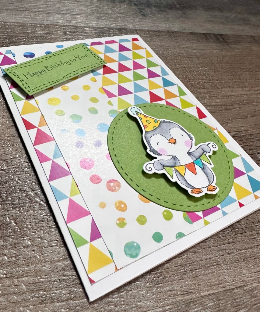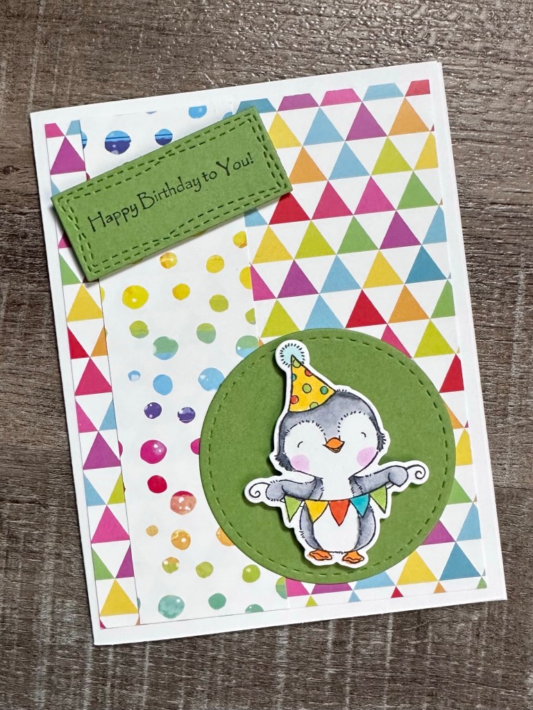 I used 2 of my favorite birthday stamps to stamp my sentiments on matching card stock. I used a label punch I’ve had forever on 2 of the cards (this is a great set of dies that are similar to my punch) and the smallest of the Wonky Stitched Rectangle dies from MFT Stamps on the penguin card.