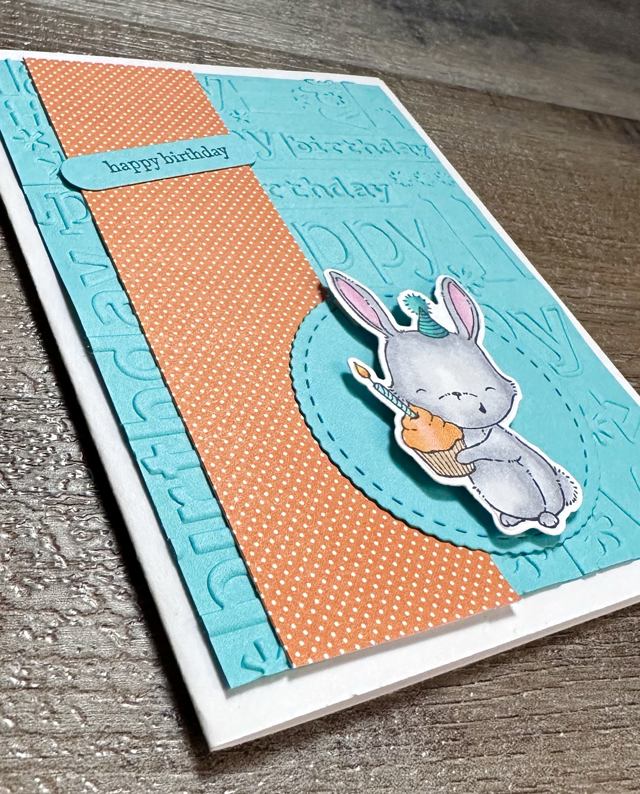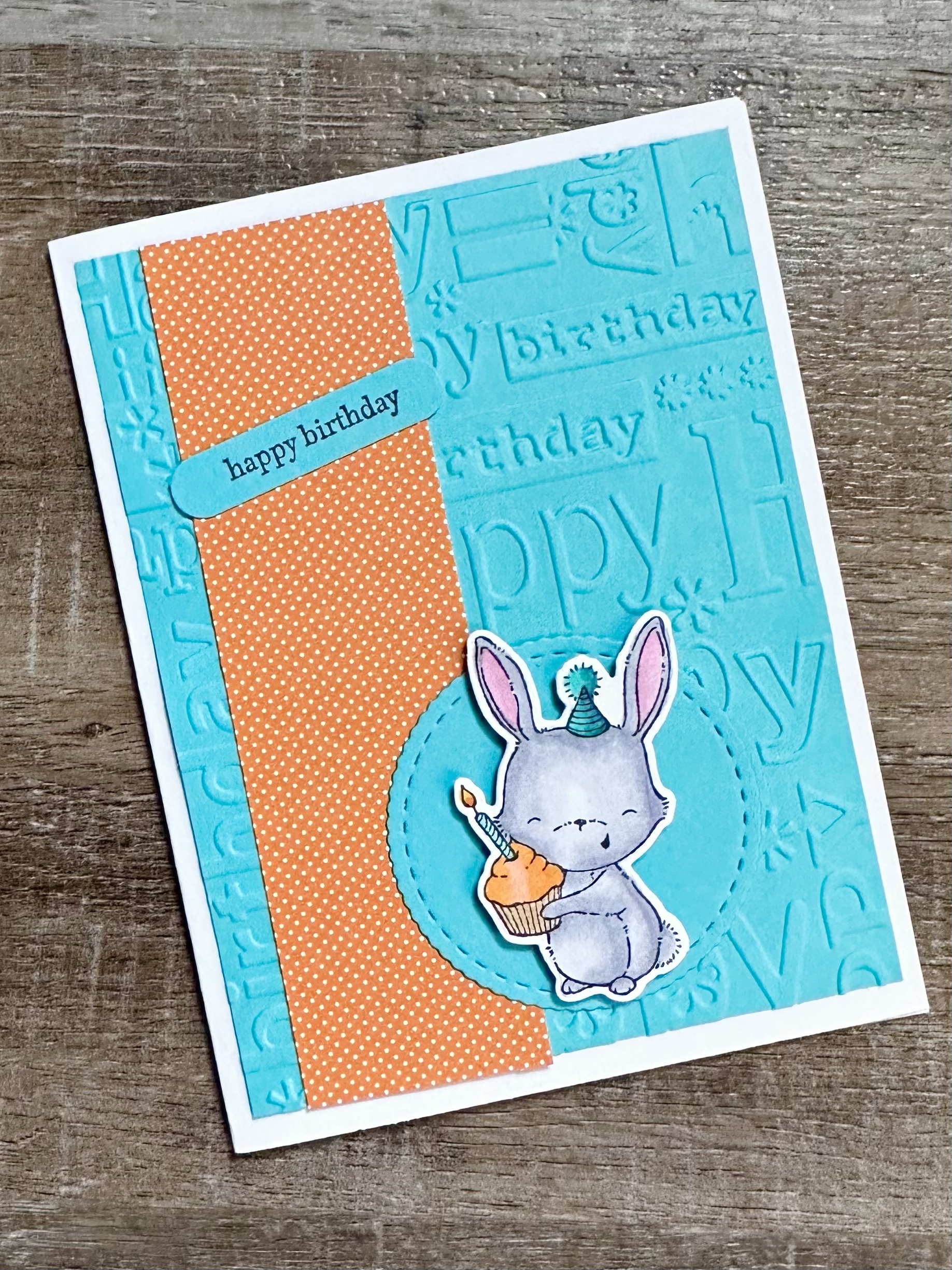 I used a birthday embossing folder (similar to this or this) to emboss a piece of turquoise card stock and attached it to a white card for the card with the bunny. I attached a piece of patterned paper to a white card for the other 2 cards. Then for each card, I added a strip of coordinating patterned paper.