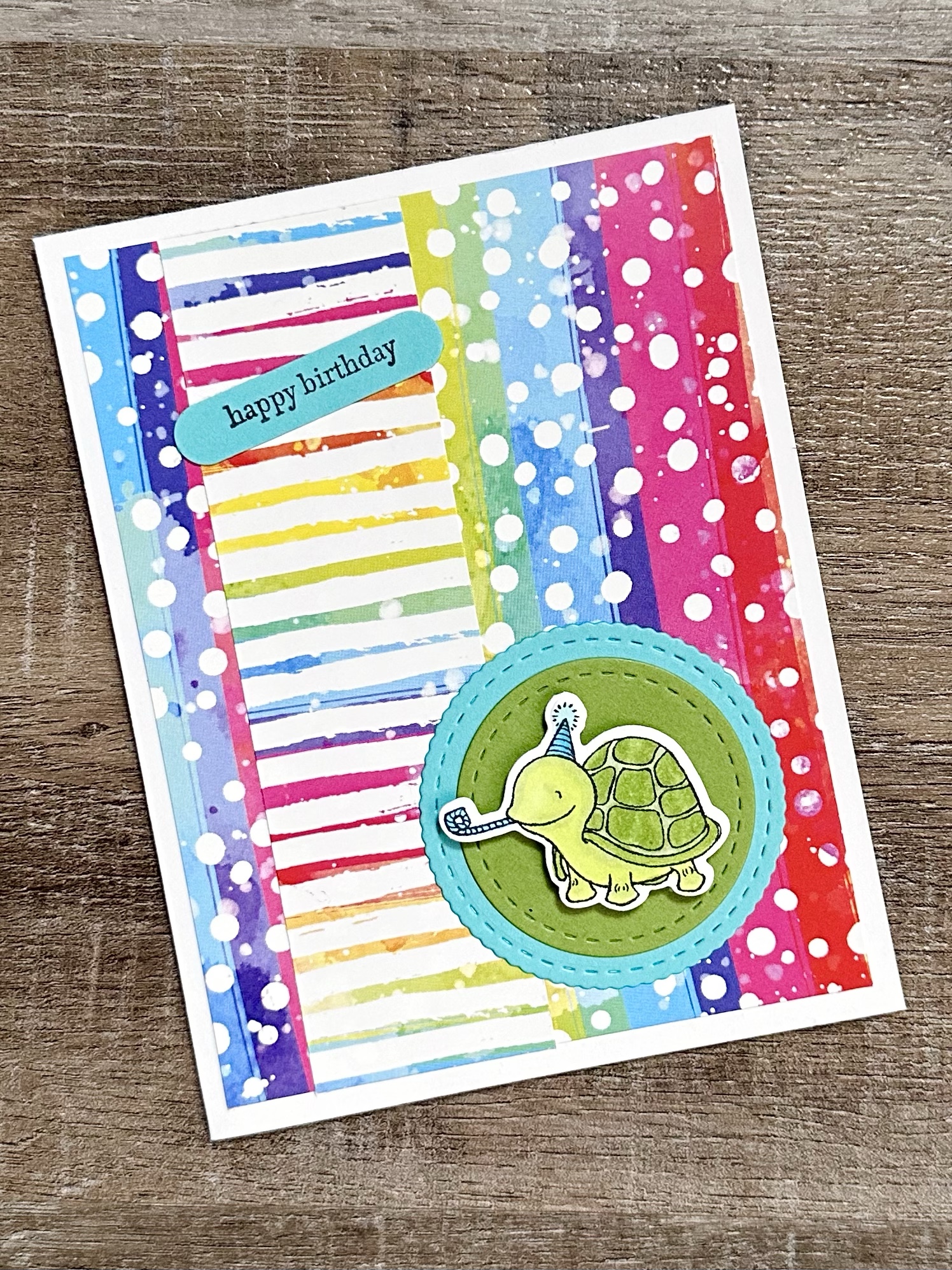 I used 2 of my favorite birthday stamps to stamp my sentiments on matching card stock. I used a label punch I’ve had forever on 2 of the cards (this is a great set of dies that are similar to my punch) and the smallest of the Wonky Stitched Rectangle dies from MFT Stamps on the penguin card.