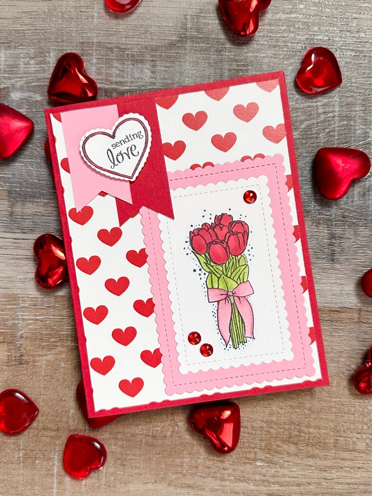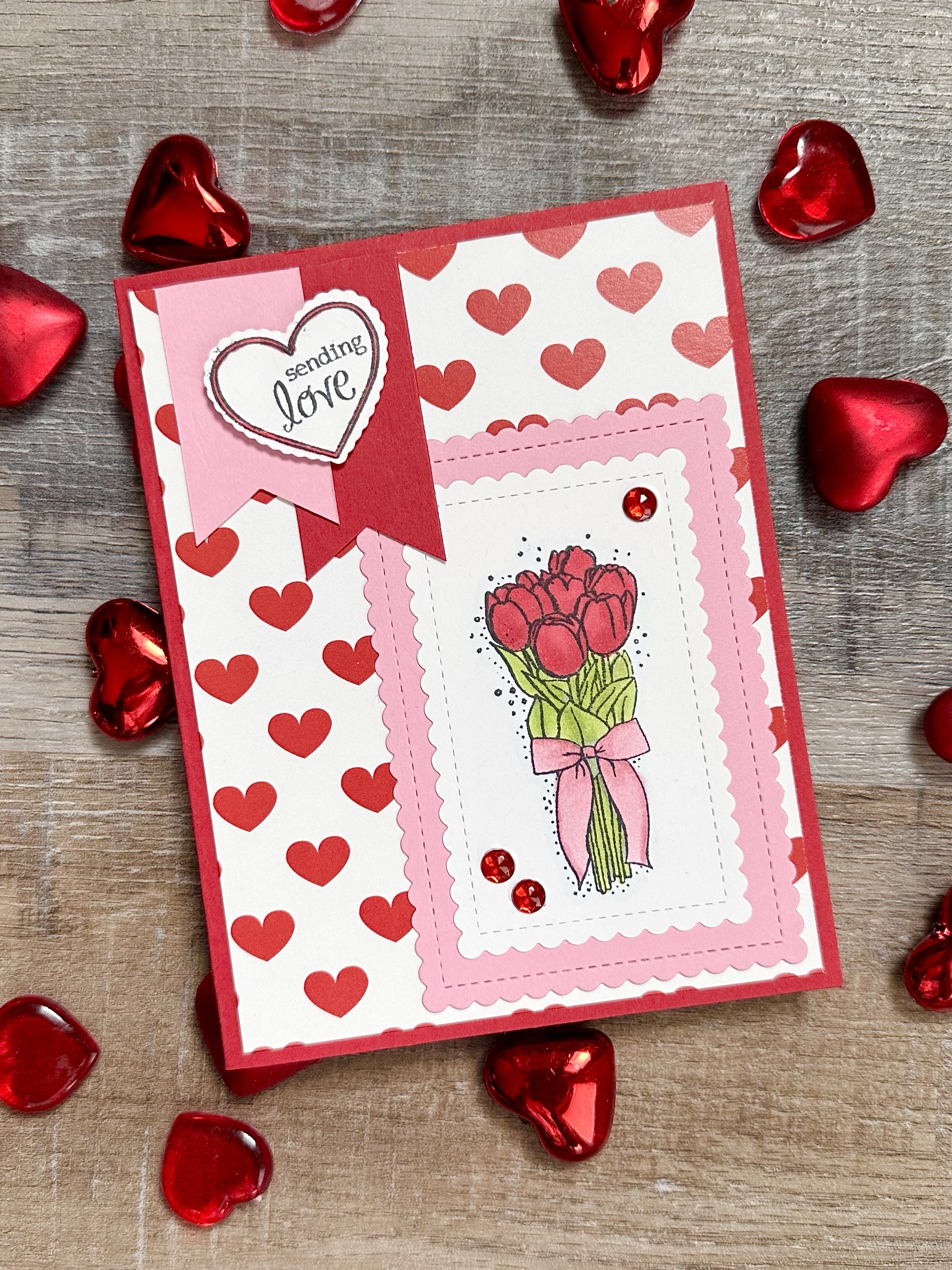 To make the card, I added a piece of patterned paper to a red card. I attached the tulip image to the bottom right corner and then added 2 small banners cut from red and pink card stock to the top of the card. I attached the heart over the banners using foam tape. To finish it off, I added 3 red rhinestones.