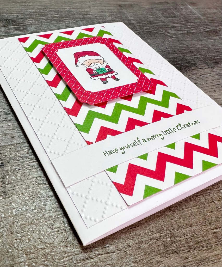 I embossed a piece of white card stock with the Dotted Lattice embossing folder from Taylored Expressions and attached it to a white card. I attached a piece of patterned paper over the embossed piece. The Santa image is attached to the card with foam tape.