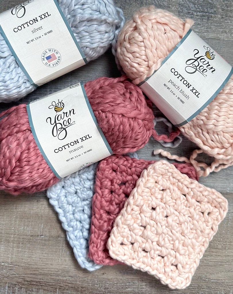 I found this fun Yarn Bee Cotton XXL yarn on clearance at Hobby Lobby. It’s bulky weight (5), has a great texture, and is so soft! I thought it would work nicely for some type of facial/spa cloth and came up with this super easy to make Crochet Chunky Cotton Facial Square.