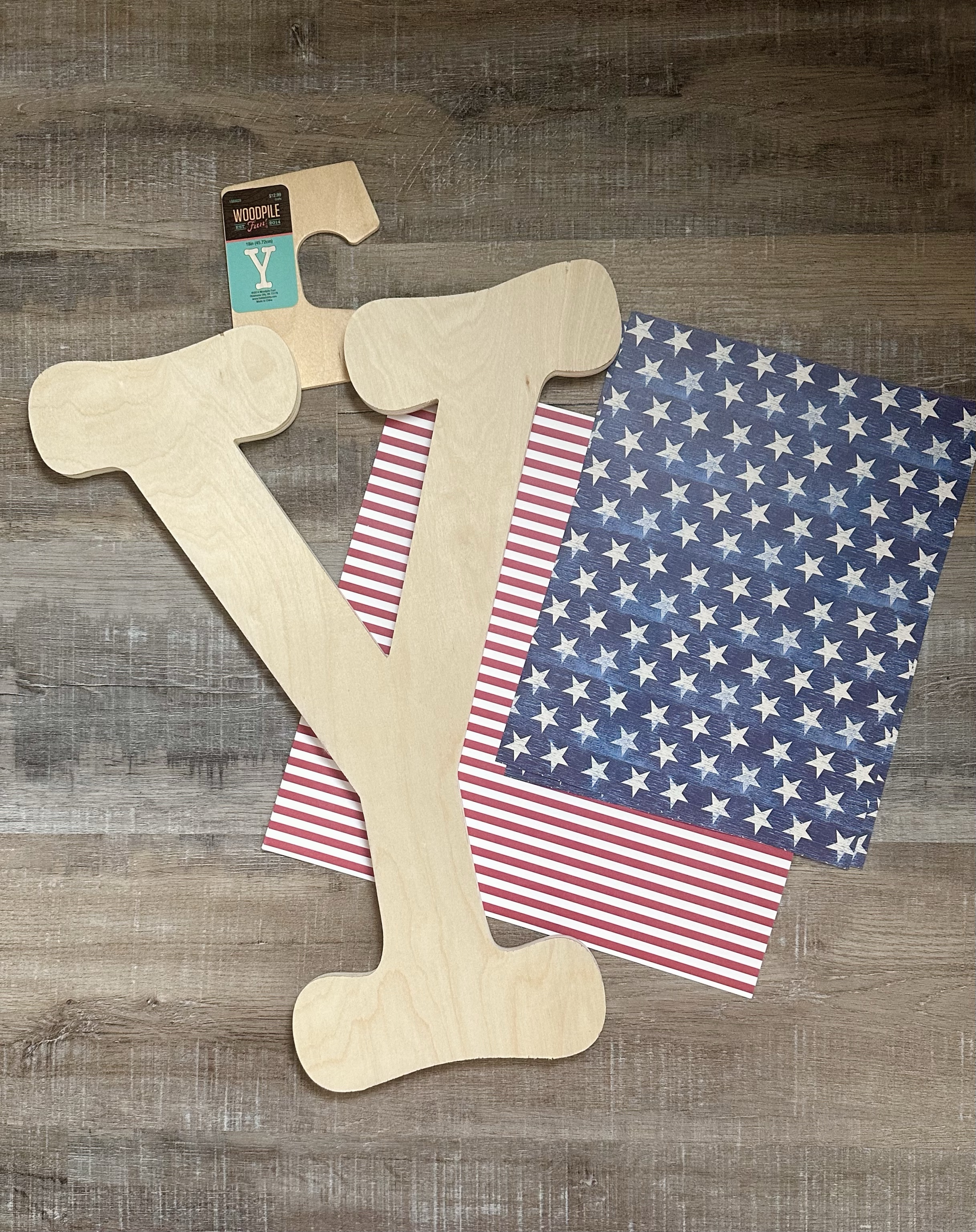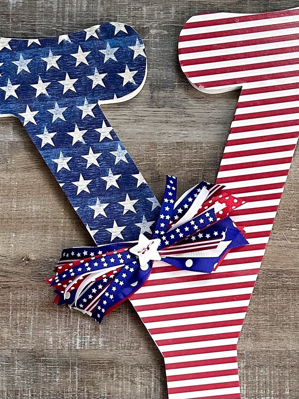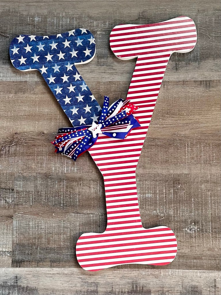 I picked up the βYβ (our last name is Young π) a few months ago during a sale not really knowing what I would do with it. (Hobby Lobby puts their unfinished wood items on sale every couple of weeks or so.) I finally decided to decorate it to add to my patriotic decor for the Summer. πΊπΈ