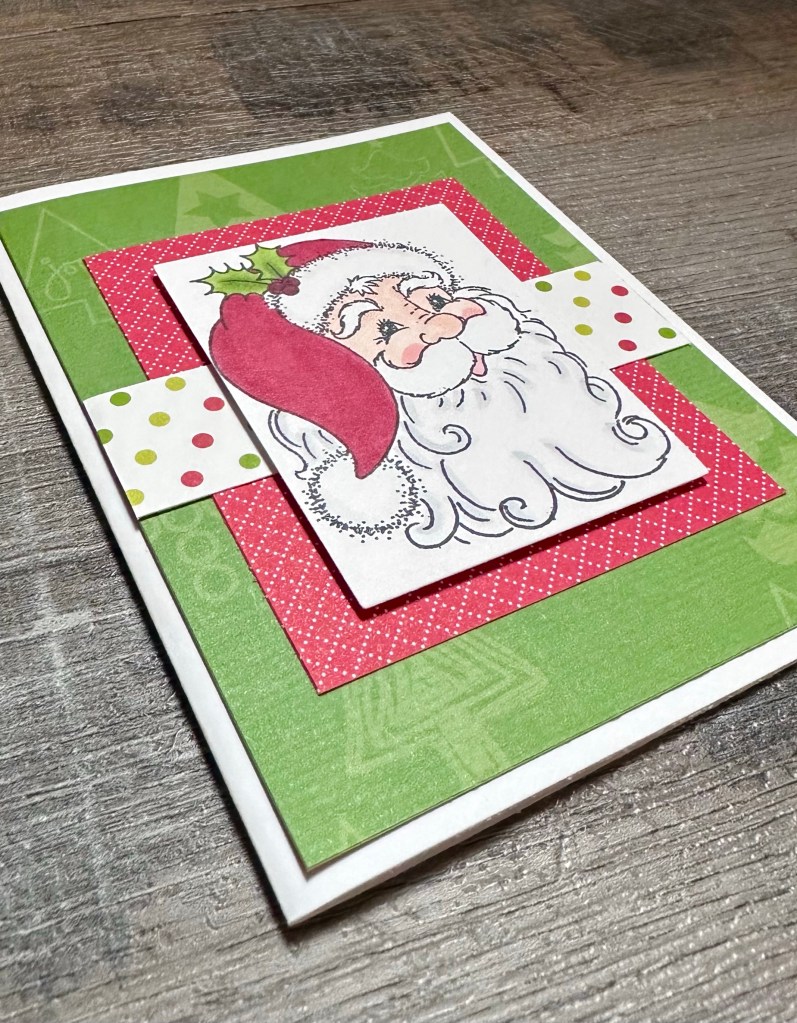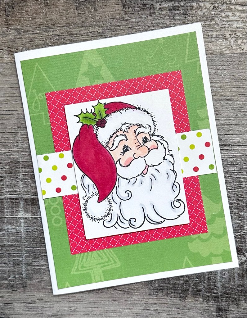 I was the lucky winner in last month’s drawing and this Jolly Santa from Your Next Stamp was in my prize package. He’s so perfect for the focal point for this month’s card! Your Next Stamp is a new company to me and they have so many cute things – you should check them out! I’m not sure if the Jolly Santa is still available, but I’m sure you will find lots of fun cute stamps and supplies on their site.