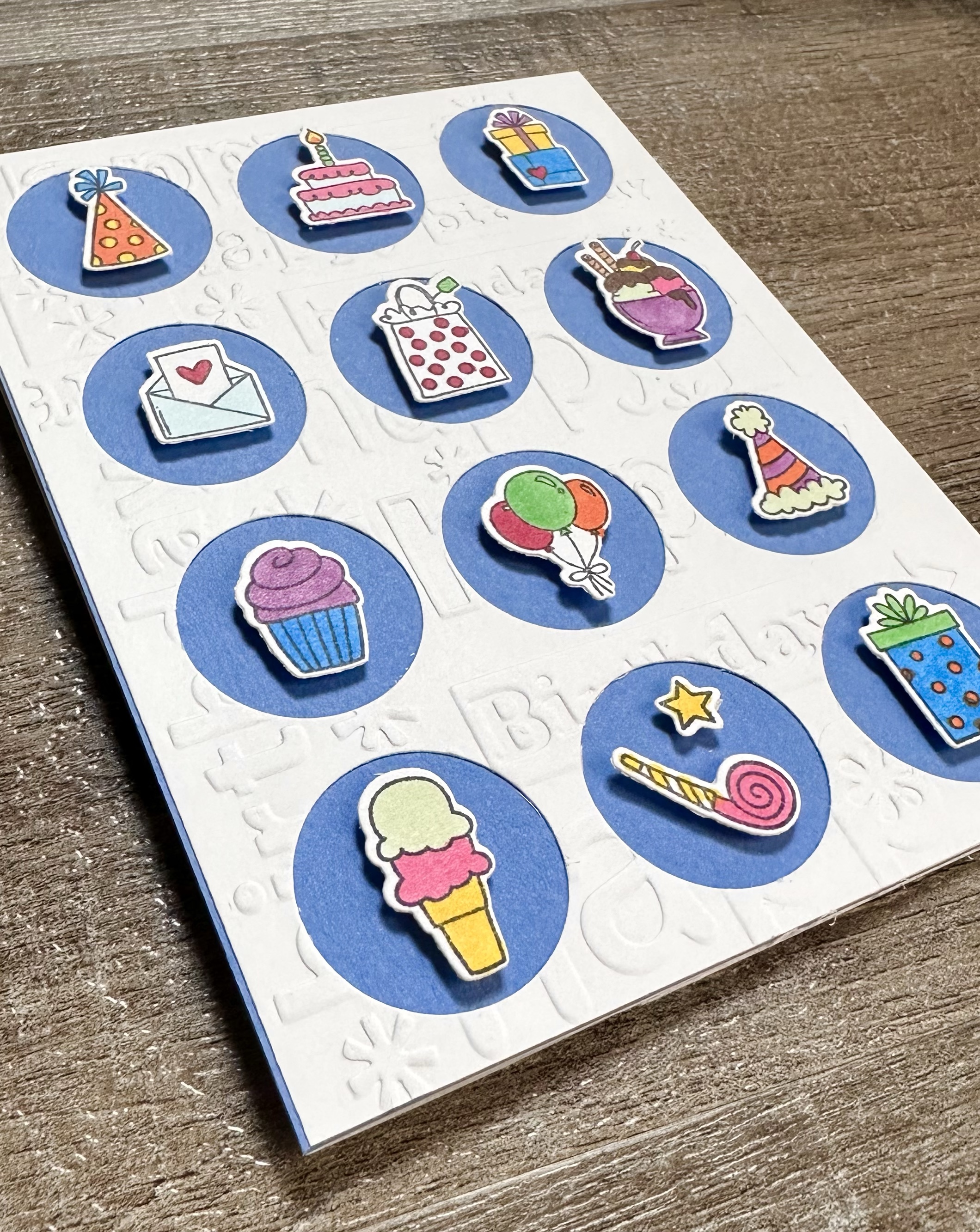 I used a birthday embossing folder (similar to this one) on a piece of white card stock. Then I die cut it with the Big Circles Cutting Plate and attached it to a blue card. Each of the birthday images is attached to the card using foam tape.