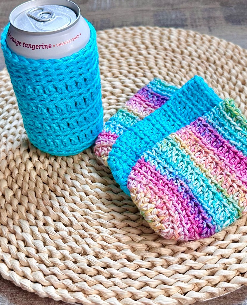I found this variegated I Love This Cotton yarn in Brights at Hobby Lobby – it made me think of Summertime and the Turquoise color goes with it perfectly. I use can cozies all the time and these colors make fun Summertime Cozies. The cozies fit 16.9 ounce bottles, too! Stitch up your cozies using your favorite cotton yarn and an H/5mm crochet hook. They work up very quickly so you can easily make several in just an evening.