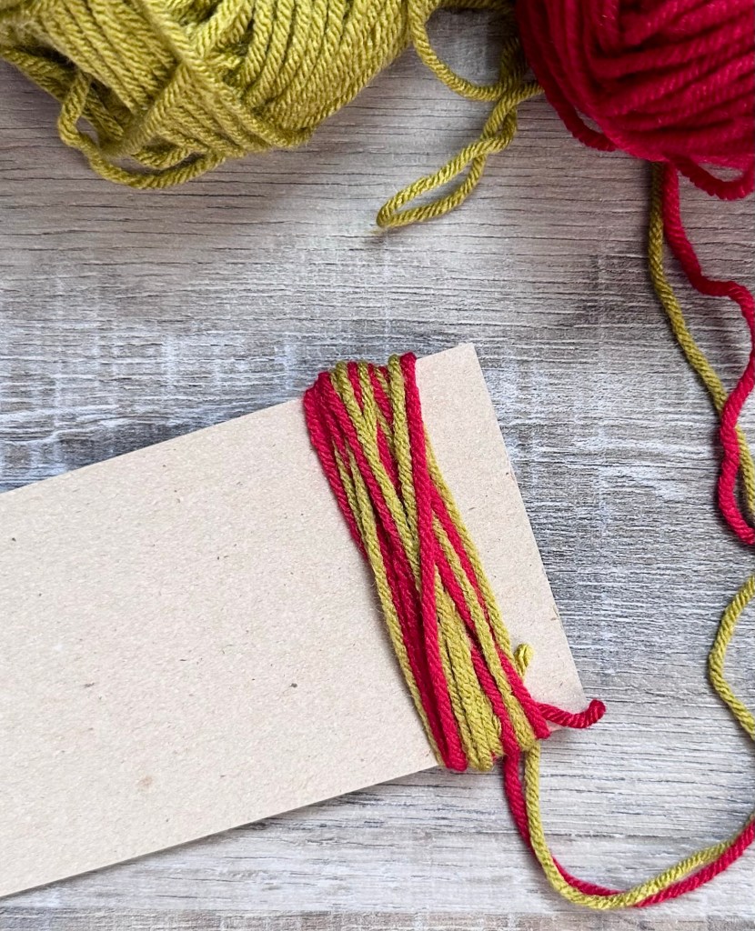 Cut a piece of cardboard about 3-inches wide. Using 1 strand of each color yarn (or 2 strands of one color), wrap the yarn around the cardboard piece to desired thickness.