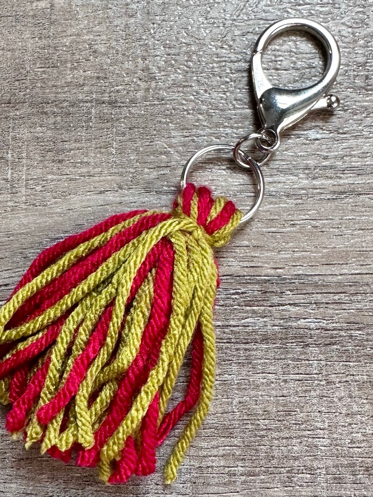 Cut one end of the yarn and slip the key ring onto the strands of yarn. Using a strand of yarn, tie tightly around all of the strands close to the key ring. Trim the tassel to desired length. Attach key chain to handle of tote.