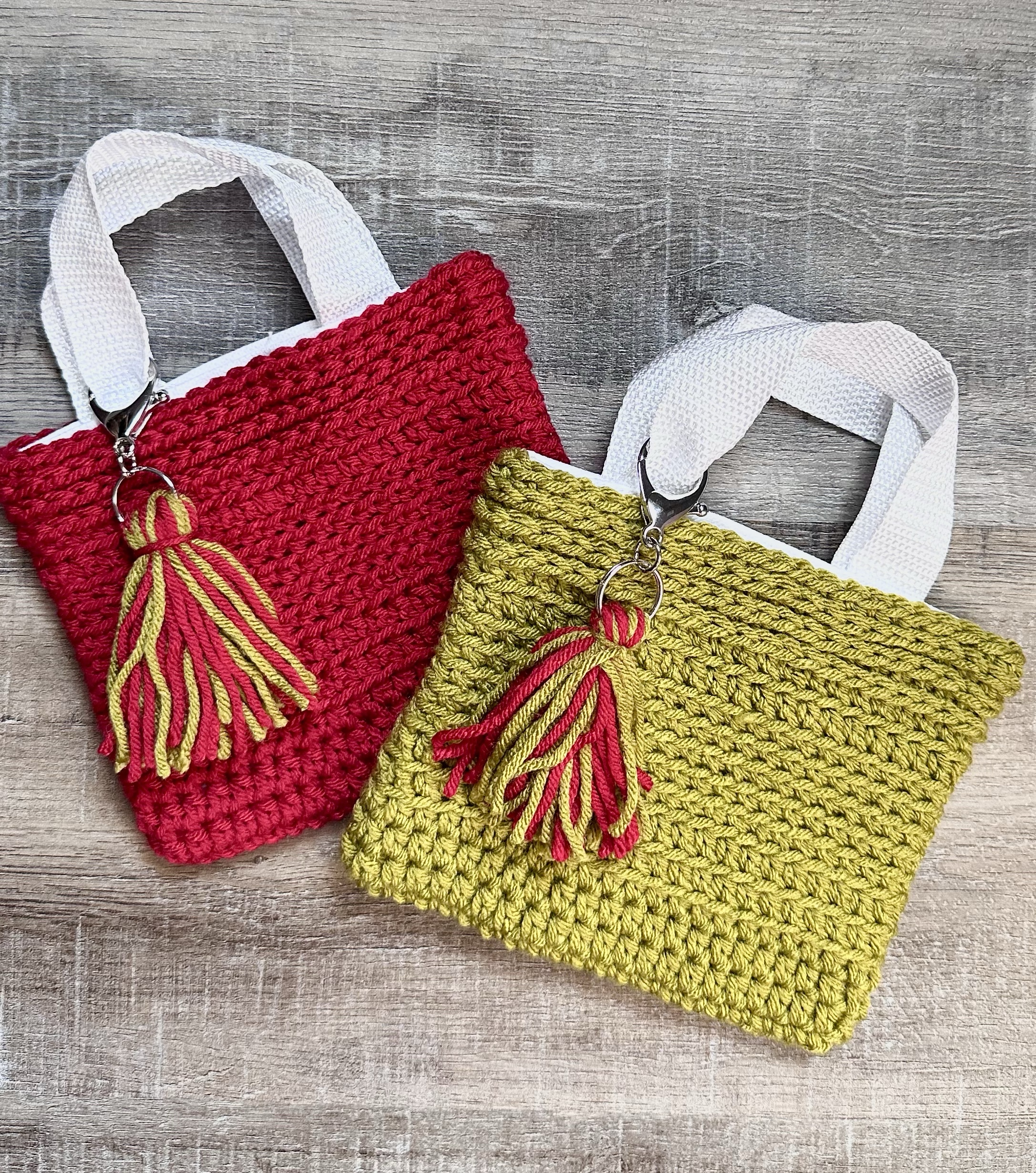 I used Yarn Bee Soft & Sleek Yarn with an H/5mm crochet hook to stitch up my gift bags. The lining of the gift bag is a small canvas bag – no sewing required! – that I picked up at Hobby Lobby. (I also found this assortment of colors here that are similar if you want something other than white.) The Lobster Clasp Keychain I used for the tassel is similar to this.