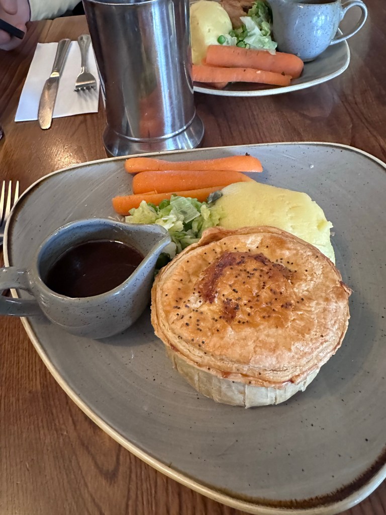 And last but not least, a few photos of some amazing food! Eggs Benedict on an English muffin, Scottish meat pie filled with chicken and mushrooms – so good!, fish’n chips for me with Bret’s Haggis with Whiskey sauce – tasted it, not my favorite!, more fish’n chips 🙂 , sticky toffee pudding – you have to have this!, and the most amazing chocolate chip cookie with chai tea at a little coffee shop called The Hungry Gull in Staffin on the Isle of Skye – look at that beautiful plate!
