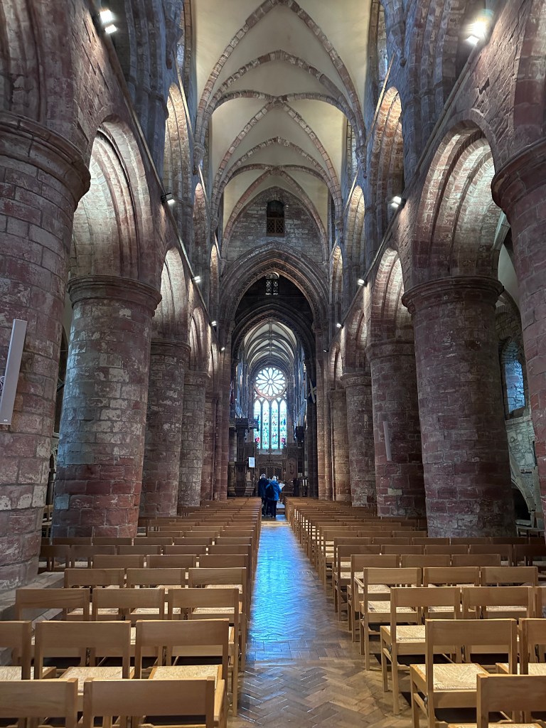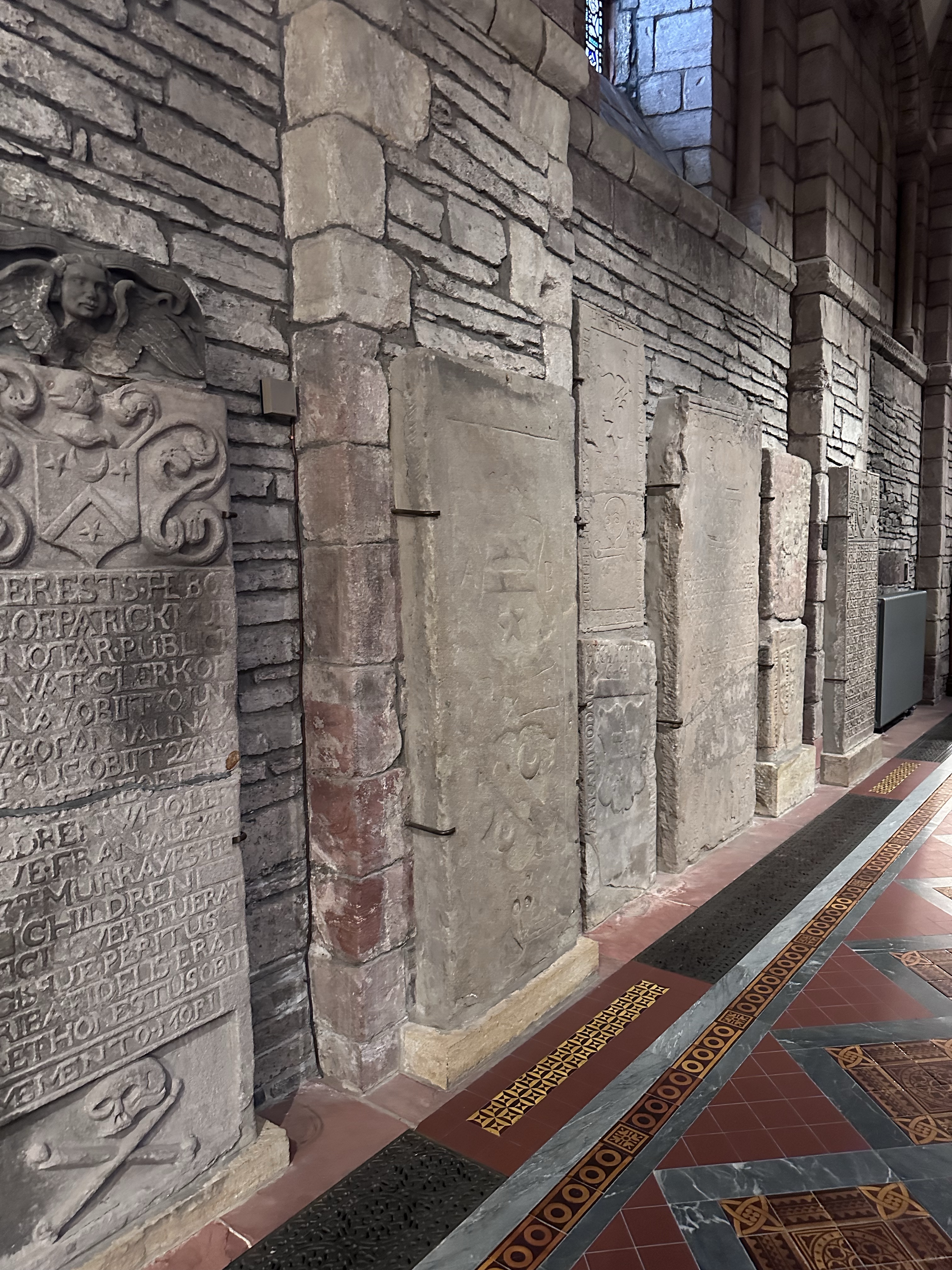 St.Magnus Cathedral in Kirkwall on Orkney is absolutely amazing! It took about 300 years to build with the foundations starting in 1137. As you can see in the middle photo below, the pillars are absolutely massive and the cathedral is just gorgeous. The large stones on the wall in the third photo below are actually grave markers of people that were buried under the floor of the cathedral. Because the floor became so uneven, the deceased were reinterred in the church graveyard and the grave markers mounted to the walls. It was fascinating reading them as we toured the cathedral. There are still services held there each Sunday as well as weddings and funerals.