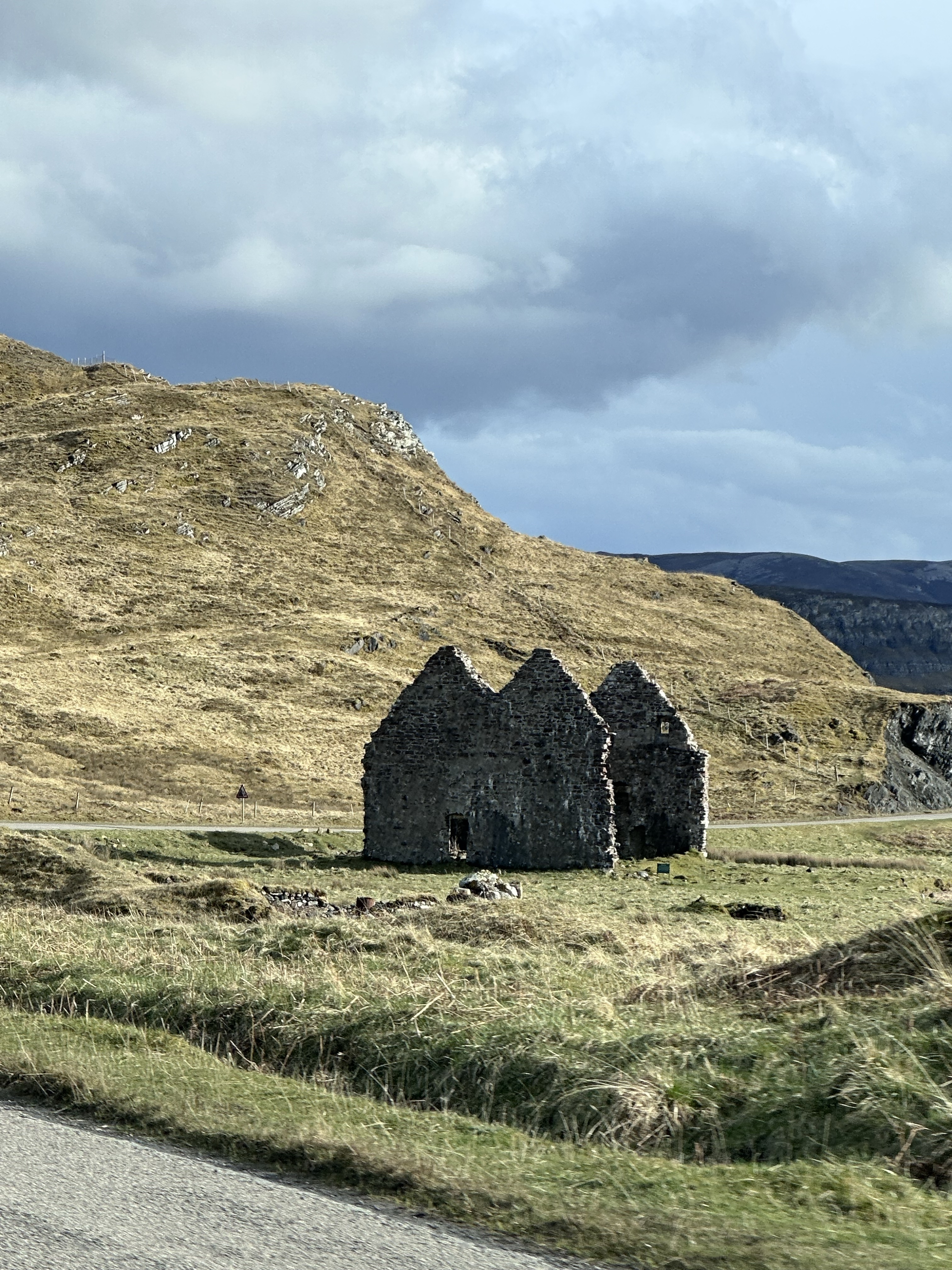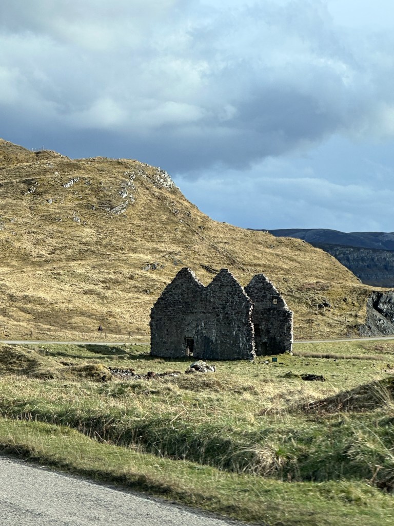 The landscape of Scotland is absolutely stunning! These are just a few of the many (many 🙂 ) photos I took of this amazing country. We all know that there are lots of castle ruins in Scotland, but we also noticed a lot of ruins of maybe abandoned farmhouses or bothies along the way – like in the 2nd photo below. The snow covered mountains below are the Black Cuillin Mountains on the Isle os Skye. The yellow flowers in the lower middle photo are called Gorse, or Whin in Scotland, and it was everywhere as we traveled the country. Such a beautiful place!!!