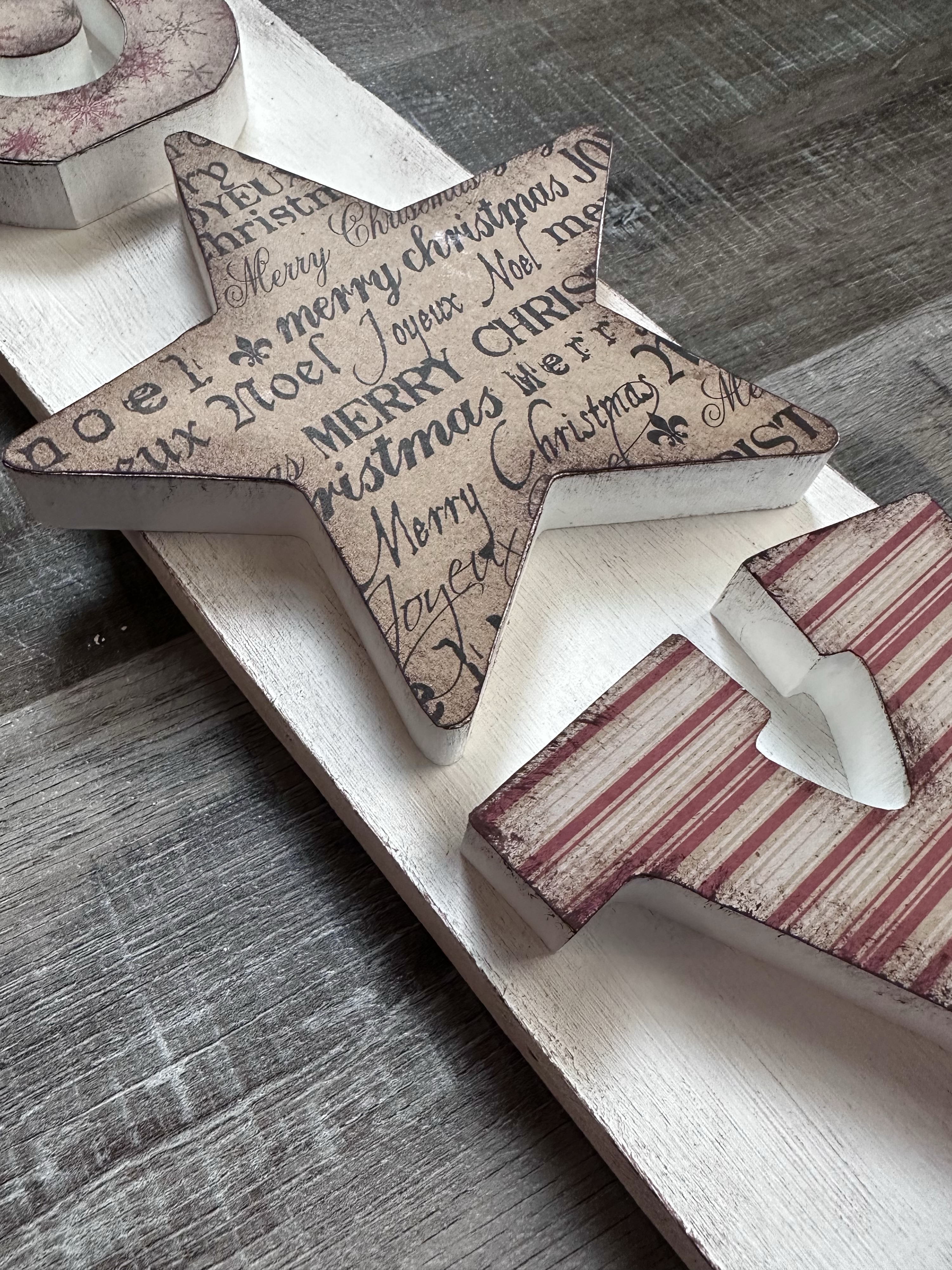 You donβt have to have the exact βJOYβ letters that I had with a star for the βOβ. You can easily use an βOβ in the middle and just pick up the individual letters at the craft store to make your sign. Depending on the size of your scrap wood piece, you could spell out βNOELβ or βJINGLEβ or any other fun holiday word. You can even paint your letters instead of using scrapbook paper.