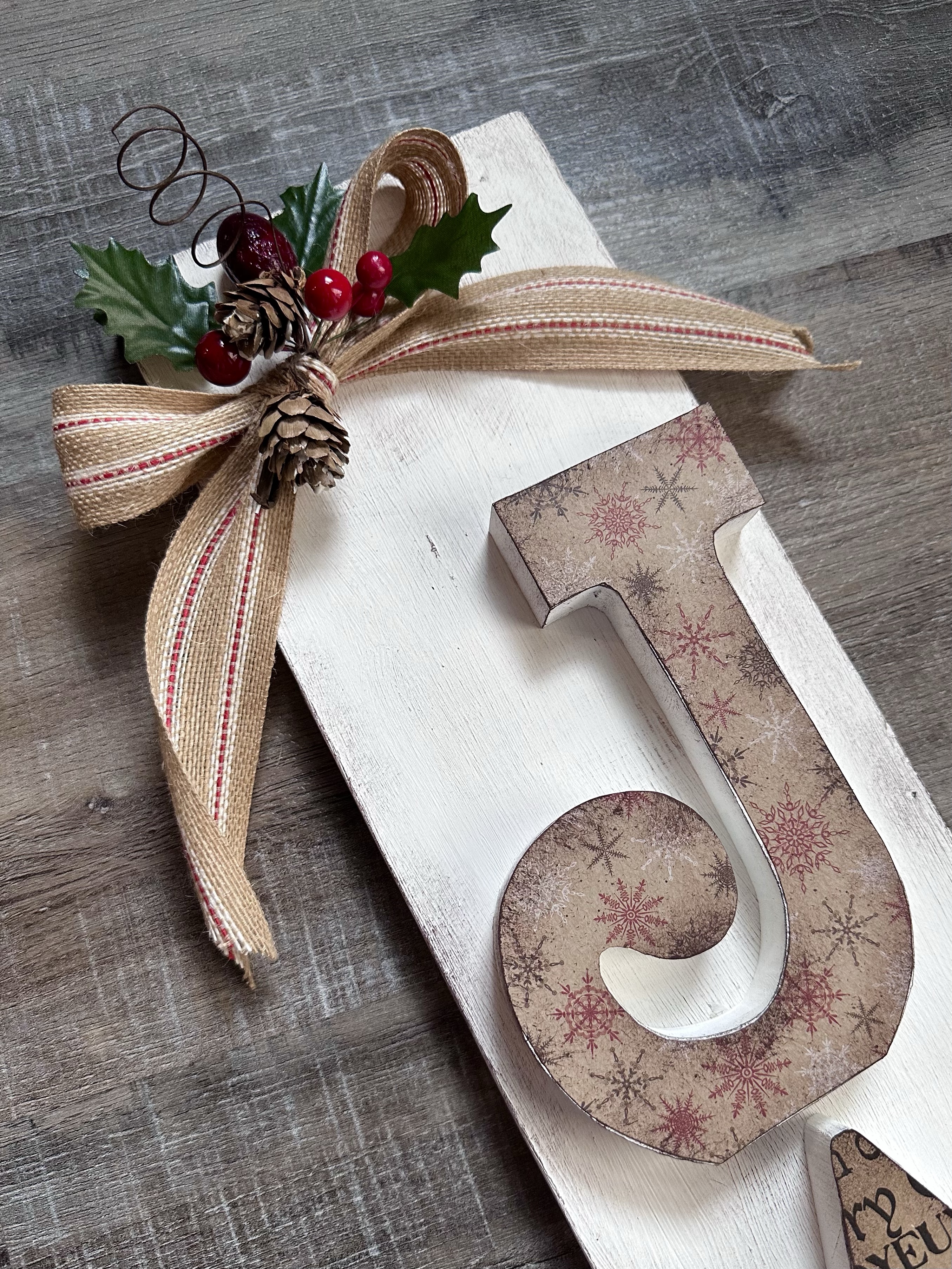 I glued my letters to the wood piece using E6000 clear adhesive. (Itβs my favorite adhesive when you need something strong!) I finished my sign off by glueing a bow and a Christmas pick on the top.