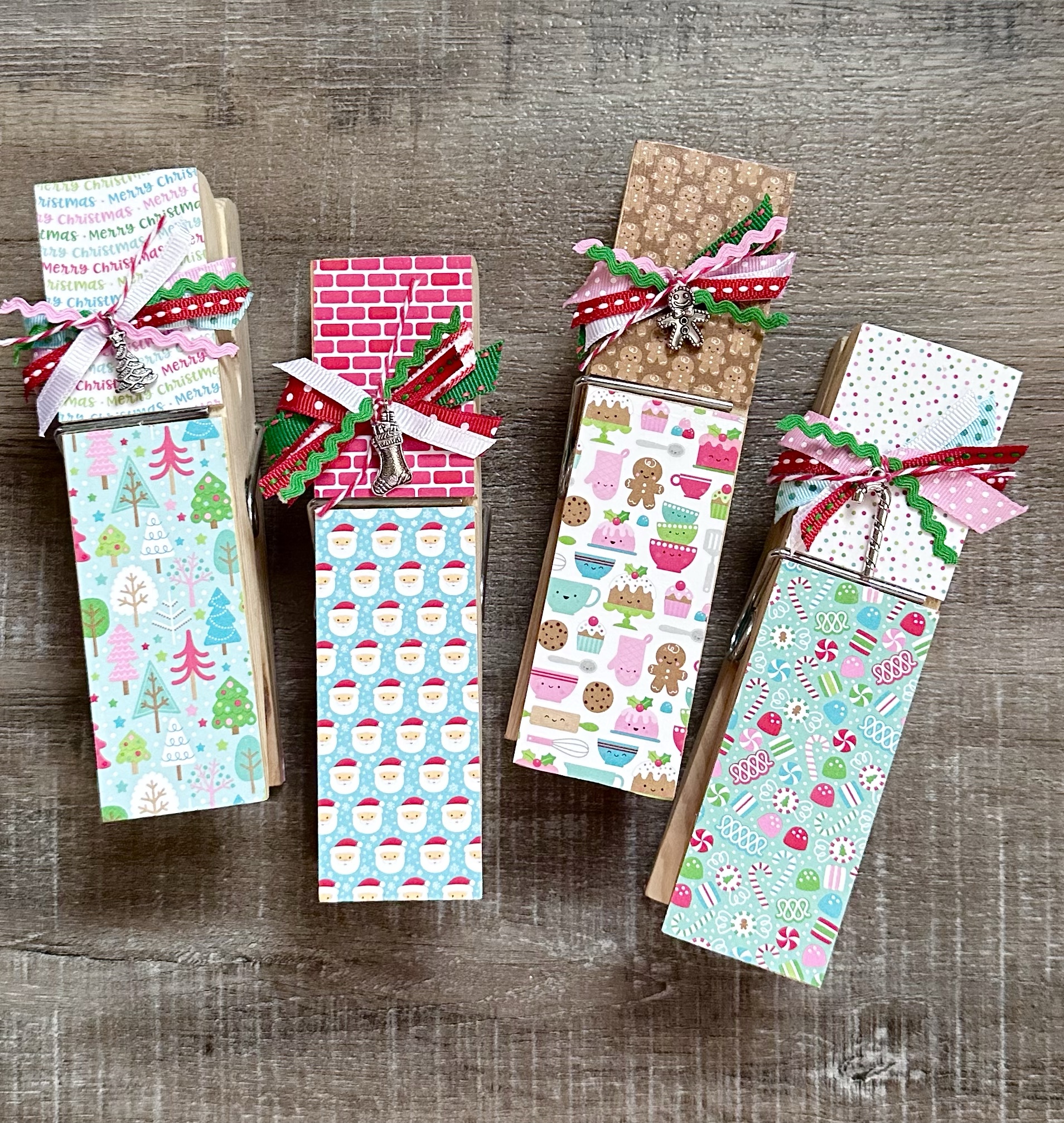 They are the perfect size to hold a recipe card or your to do list and look cute on your counter. I thought they would be fun to decorate for Christmas to hold those recipe cards while baking up all the goodies for the season. I pulled some 6 by 6 inch Christmas patterned papers from my stash and got to work! 😊