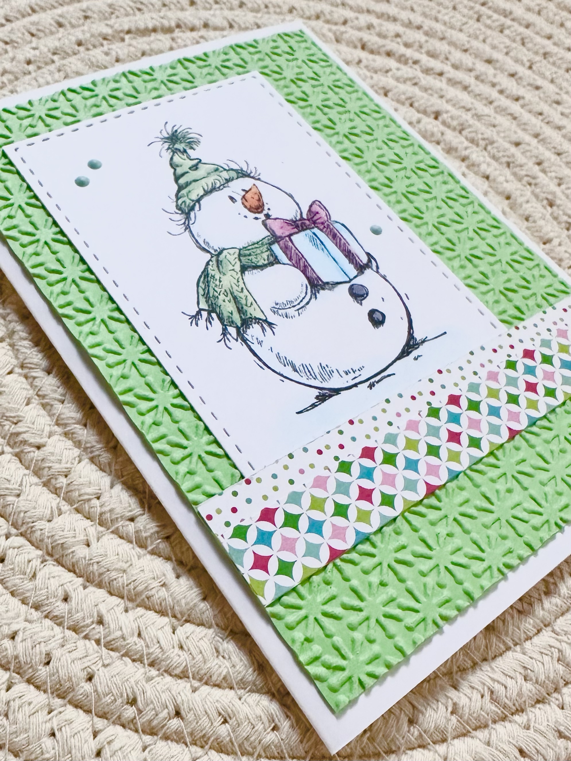 I stamped the snowman with Memento Tuxedo Black ink on white card stock and colored it with Copic makers. I die cut around the image with the Scalloped & Rectangles Nesting Dies from Unity Stamp Company. I embossed a piece of green card stock with a snowflake embossing folder. This particular folder is discontinued, but this Snowfall Embossing Folder would be so cute with this snowman. I attached the embossed piece to a white card. Then I attached the stamped image to the card and added 2 strips of coordinating patterned paper. To finish the card, I added 3 dots of Peppermint Candy Nuvo Drops.