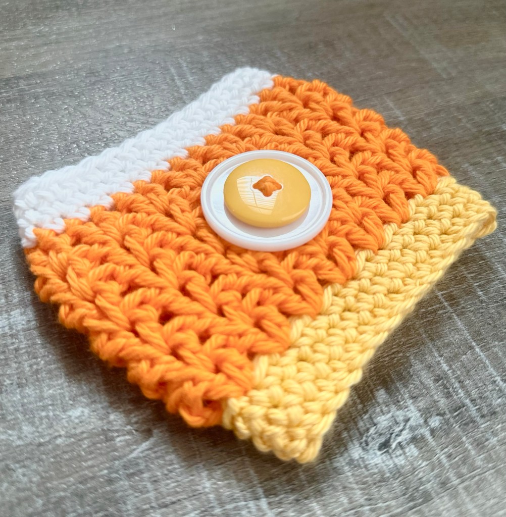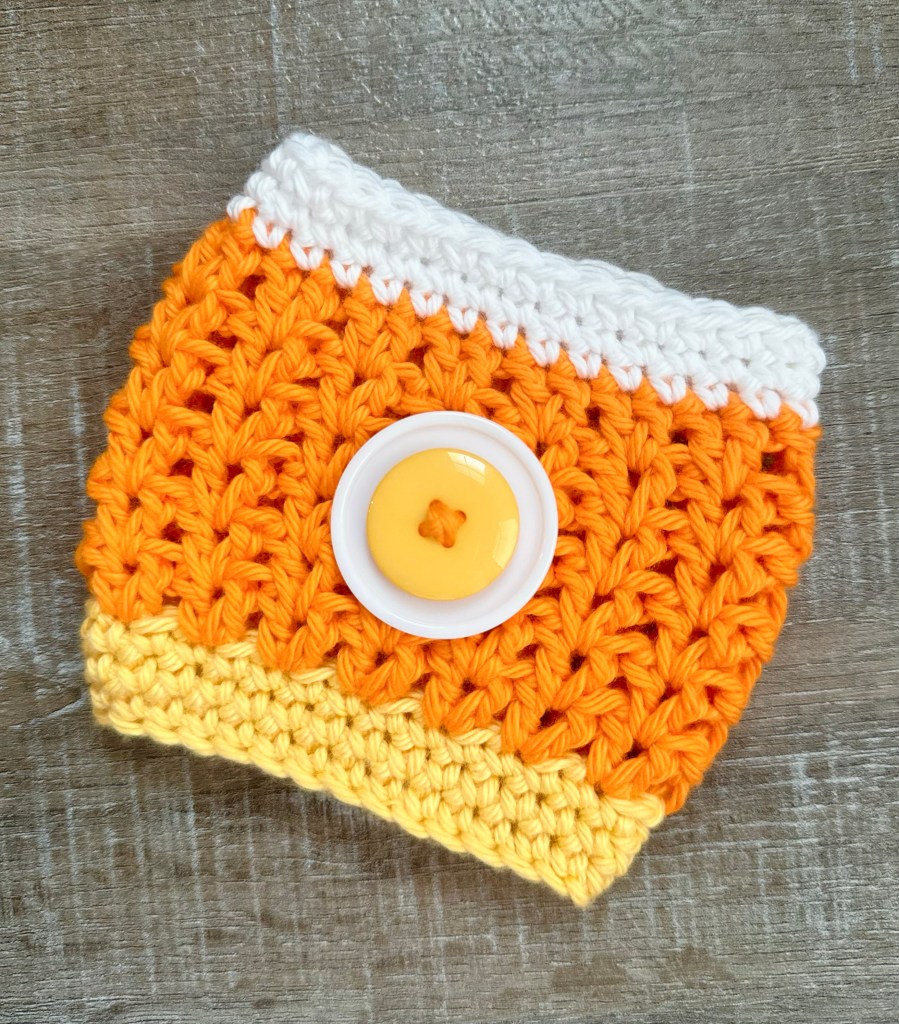 It’s still hot in Alabama, but I’m dreaming of cooler Fall temps! Whether you’re a fan of candy corn or not, when it pops up in the stores it means Fall is on the way. I have a fun, easy Crochet Candy Corn Cup Cozy pattern to hold your Pumpkin Spice Latte. 🙂