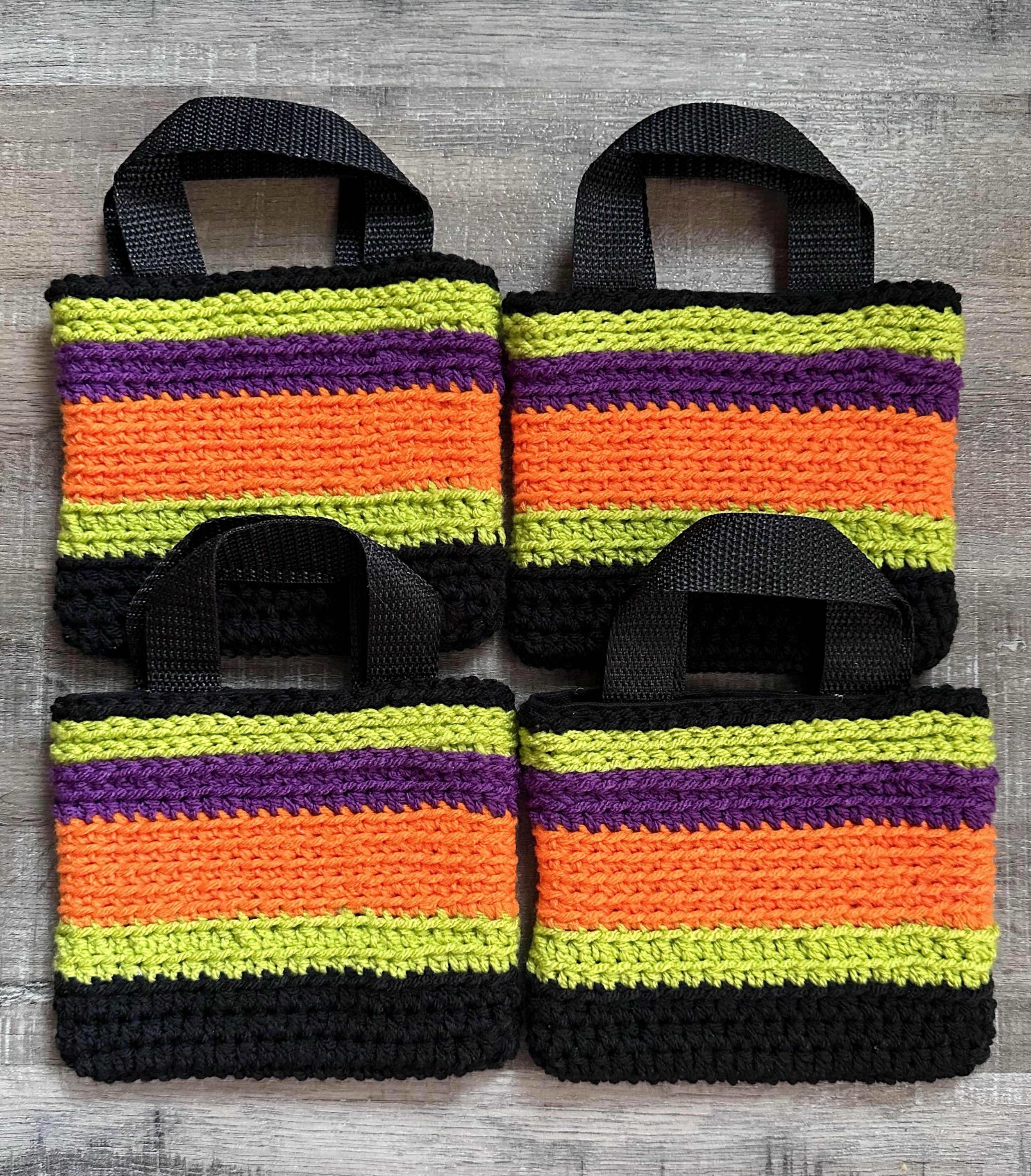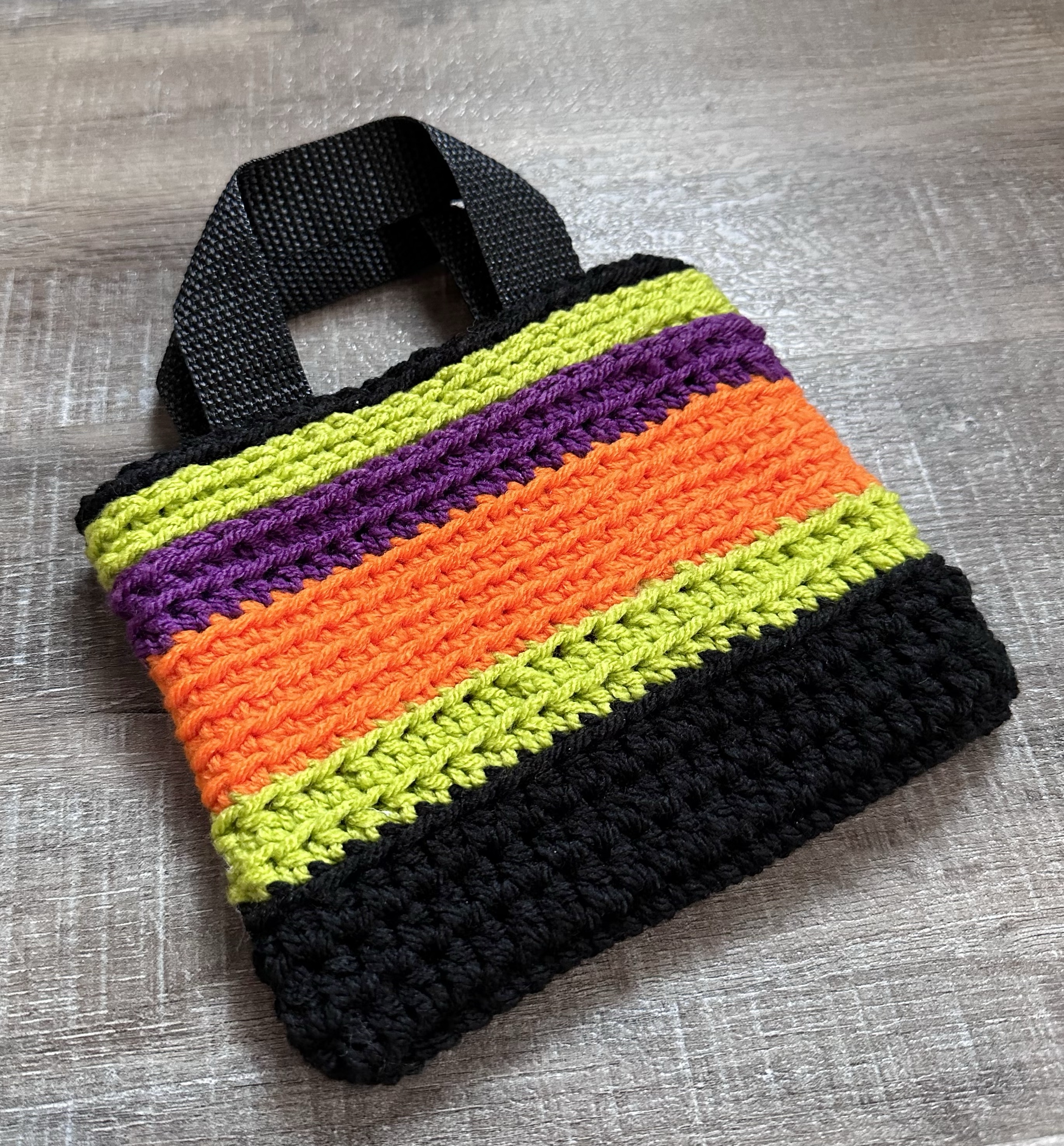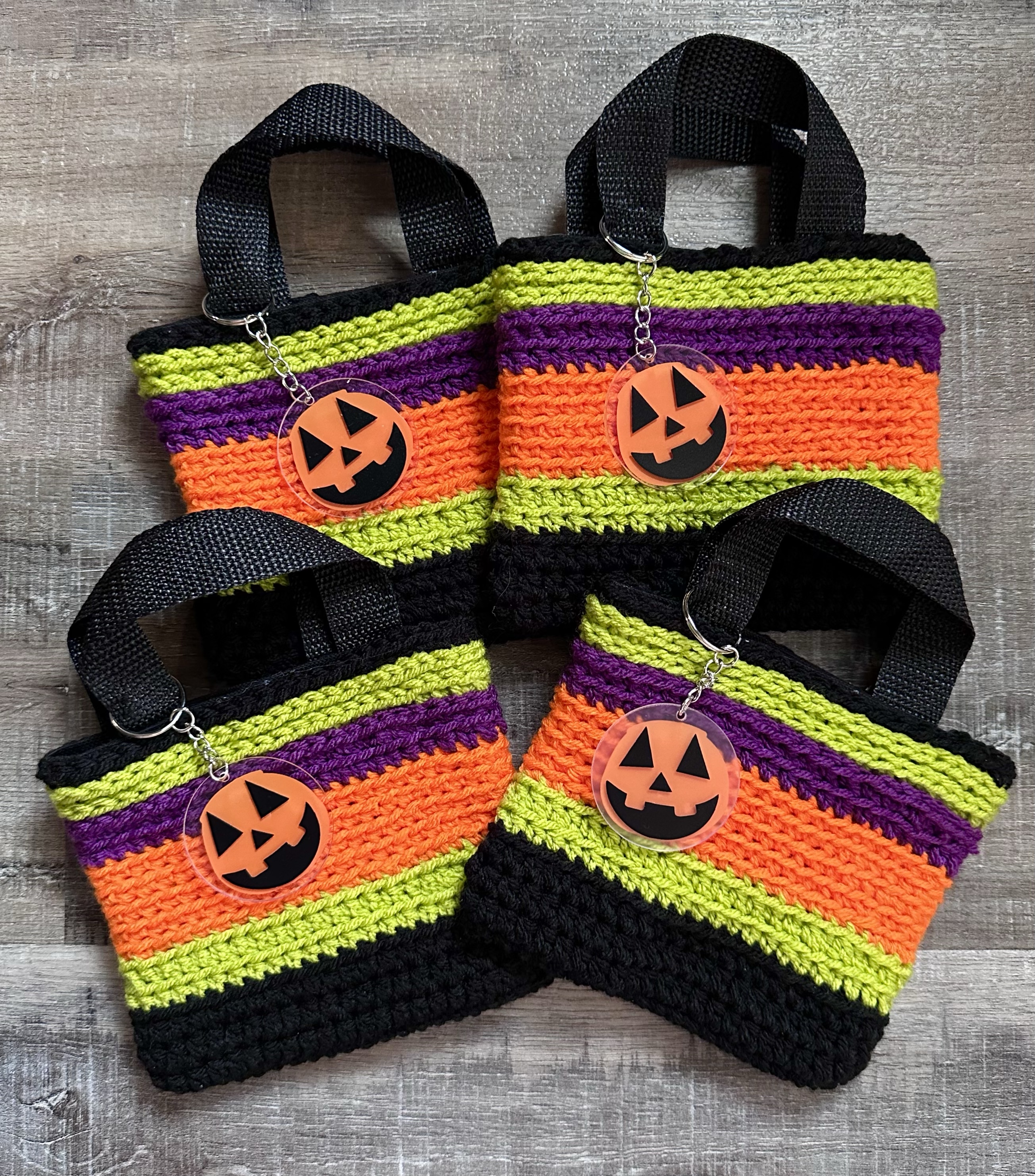 The Crochet Mini Halloween Treat Bag works up quickly and by using a premade mini canvas tote bag there is no sewing involved in lining it!