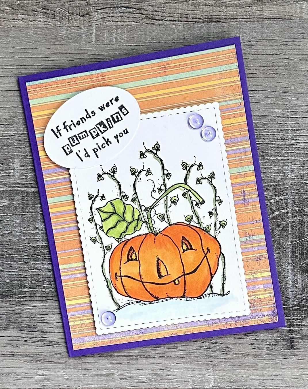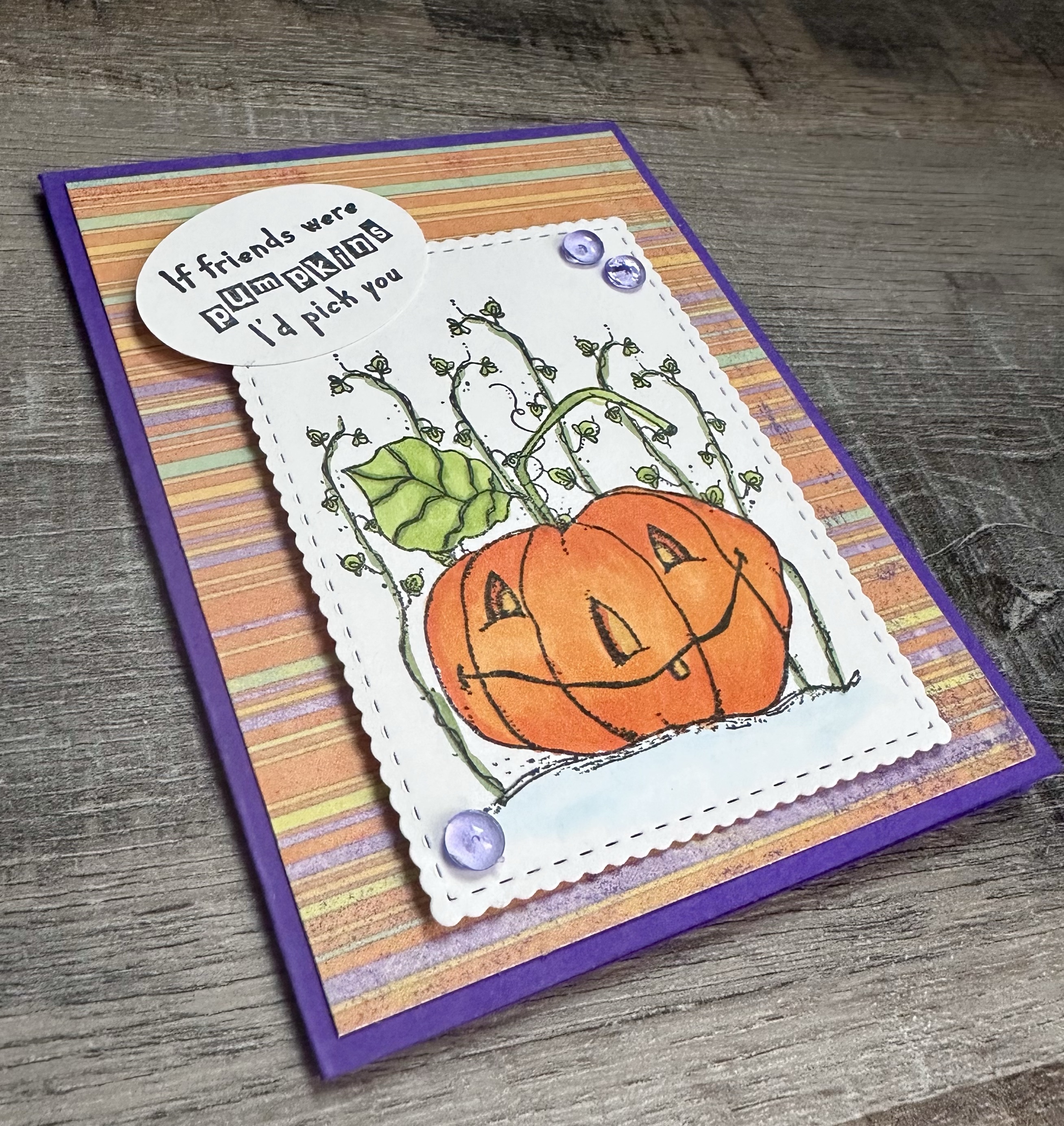 I attached a piece of patterned paper to a purple card. The pumpkin image is attached to the card with foam tape. The sentiment is attached to the upper left corner of the pumpkin piece. To finish the card, I added 3 purple Dew Drops.