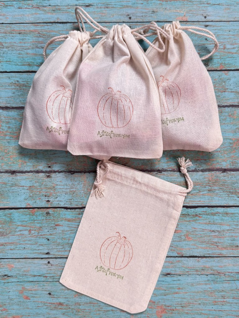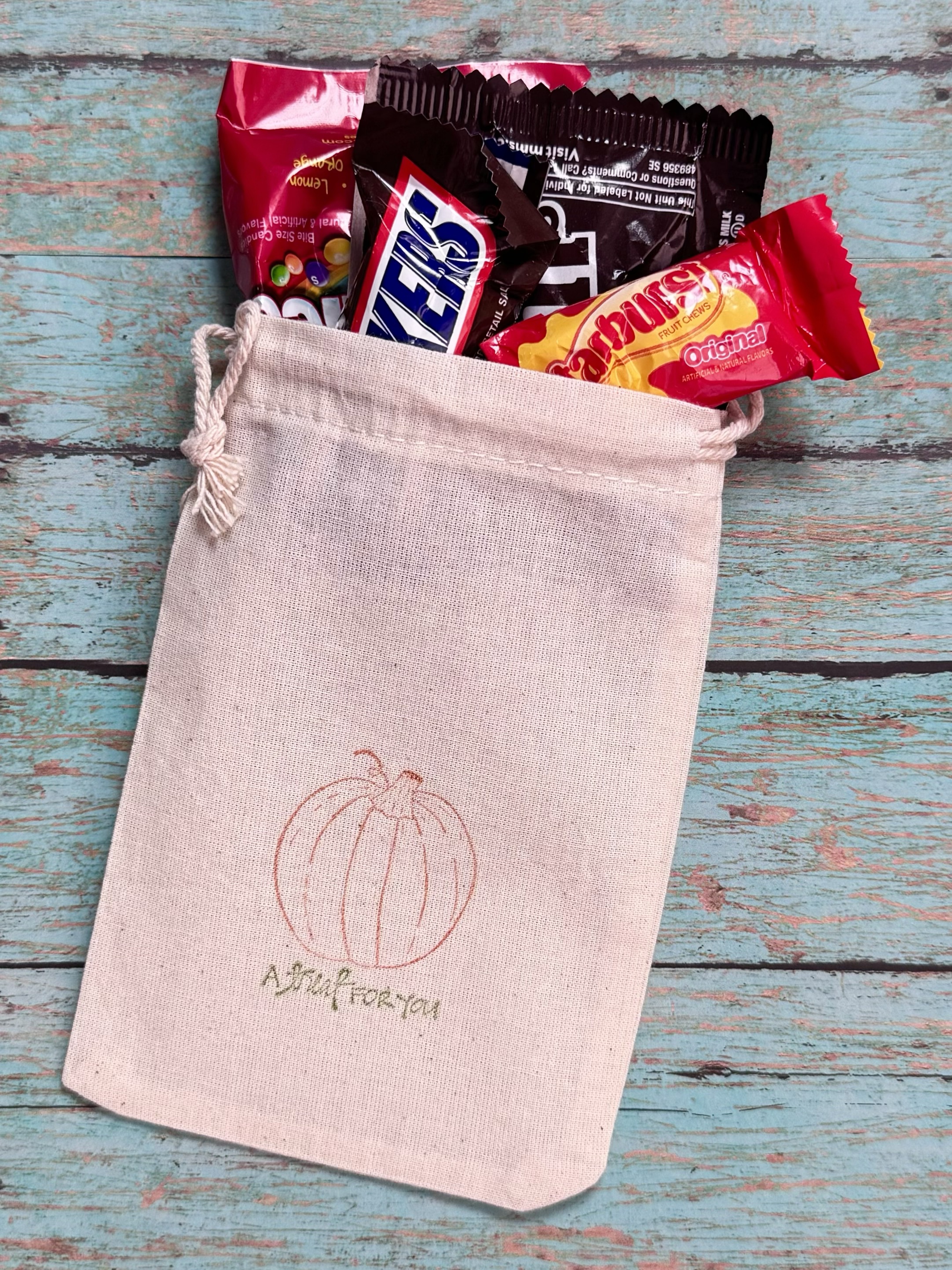 These little cotton muslin drawstring bags are the perfect size for treat bags. They measure about 4 by 6 inches and you can fit several fun size candies in the bag. I’ve stamped on them for Valentine’s Day, Easter, Thanksgiving, and Christmas. This year I added Fall to the list. 🙂