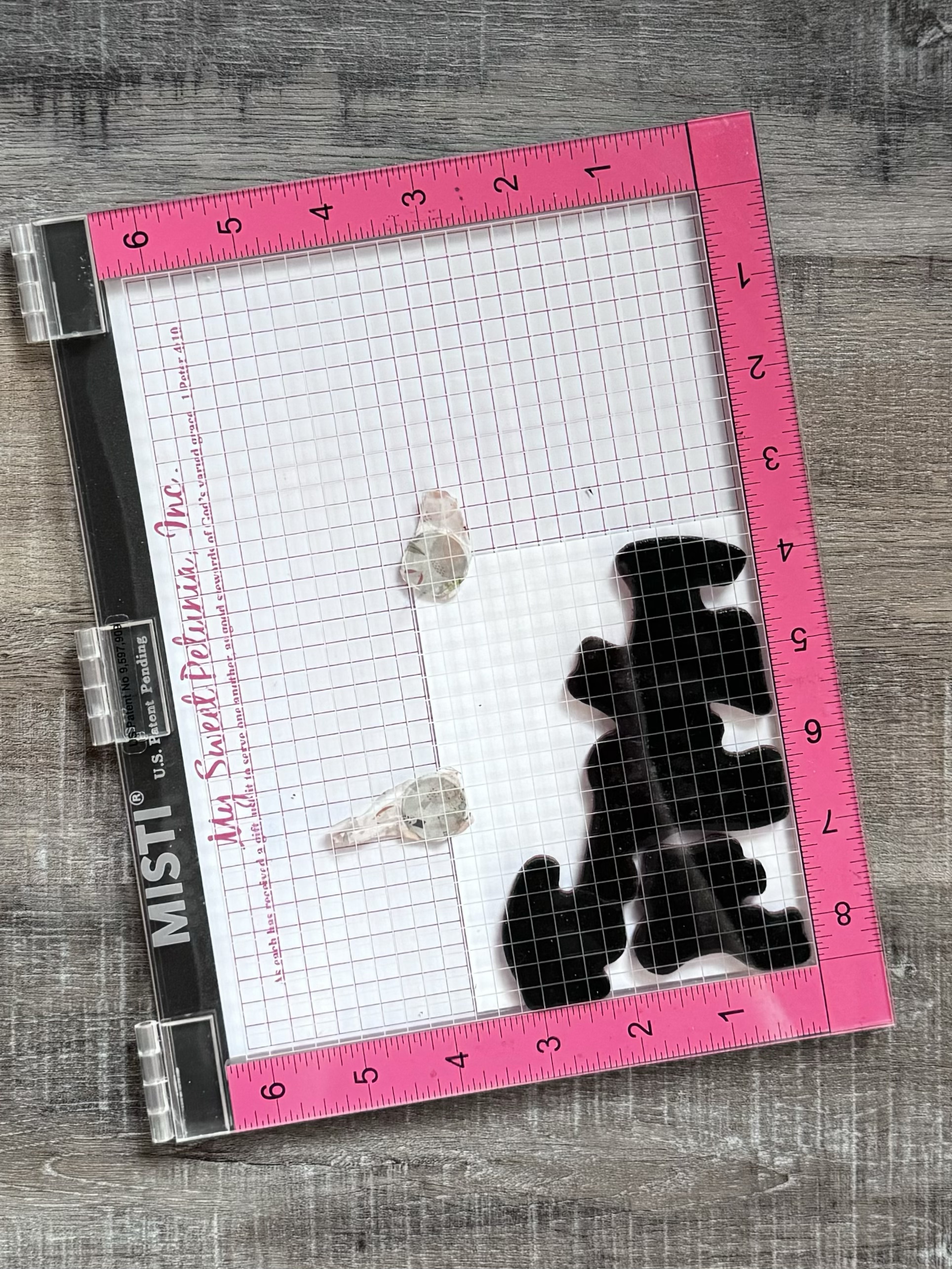 I used my MISTI Stamping Tool to stamp the image and sentiment on a 5 by 3.75 inch piece of white card stock. The MISTI is such a great stamping tool! First you line up your stamps where you want them to stamp onto the card stock. Close the cover so the stamps stick, open it up, ink your stamp, and close the cover to stamp the image onto the card stock. Image didn’t stamp well? No worries, just re-ink your stamp and stamp it again! It’s perfectly lined up so you’ll get a dark crisp image every time.
