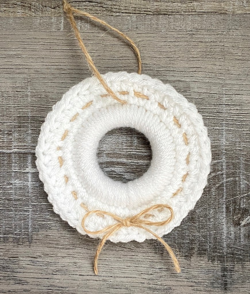 A simple crochet wreath ornament is great for the tree and also makes a fun package tie on.