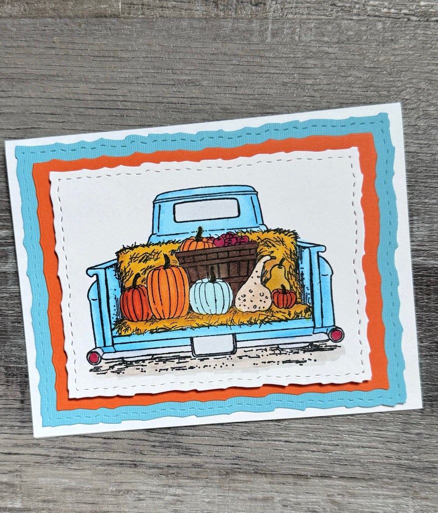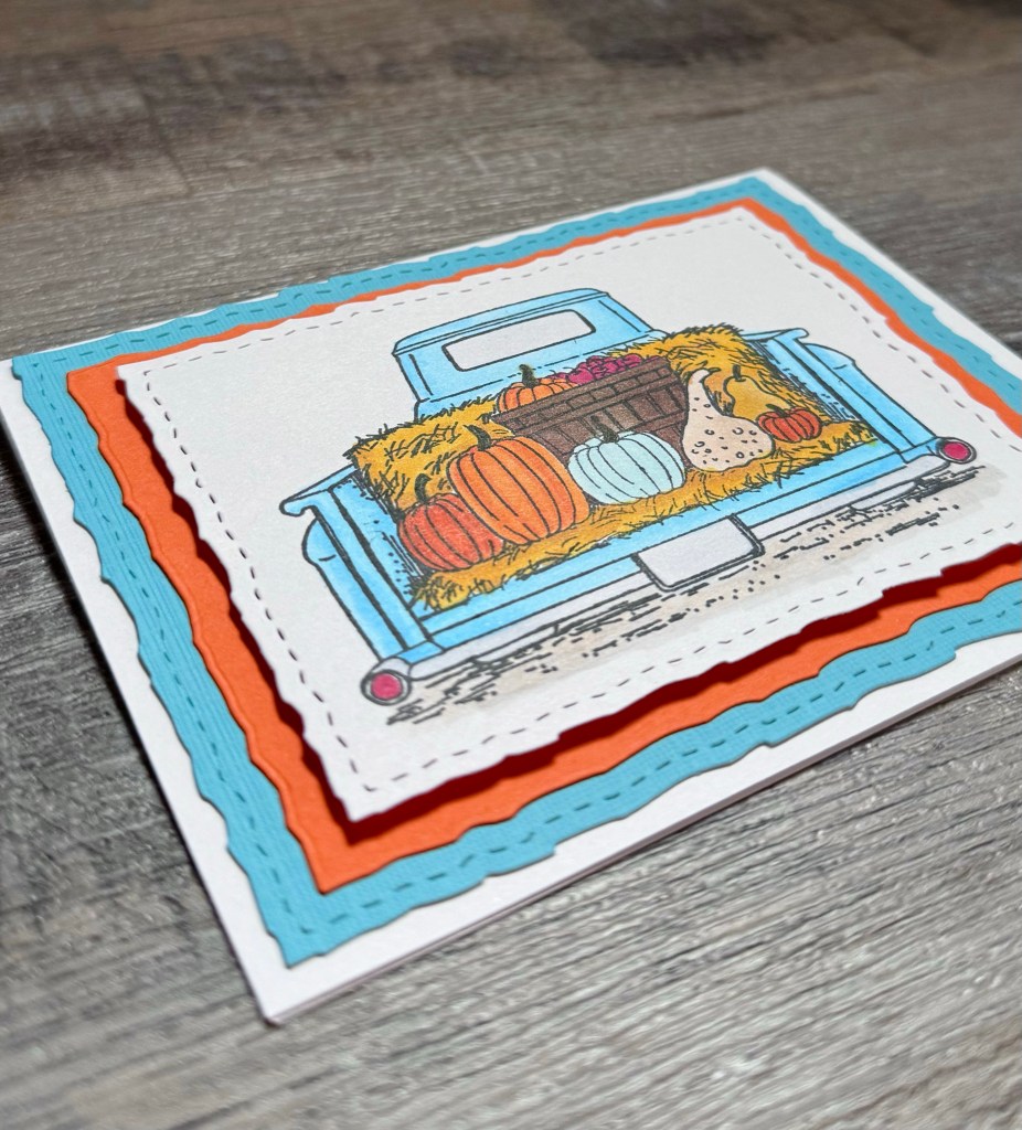 I stamped the truck with Memento Tuxedo Black ink on white card stock and colored it with Copic markers. Using the Deckle & Stitches Nesting Die Set from Unity Stamp Company, I die cut around the stamped image. With the same die set, I die cut orange and turquoise card stock and layered them into a white card. I attached the stamped piece to the card with foam tape.