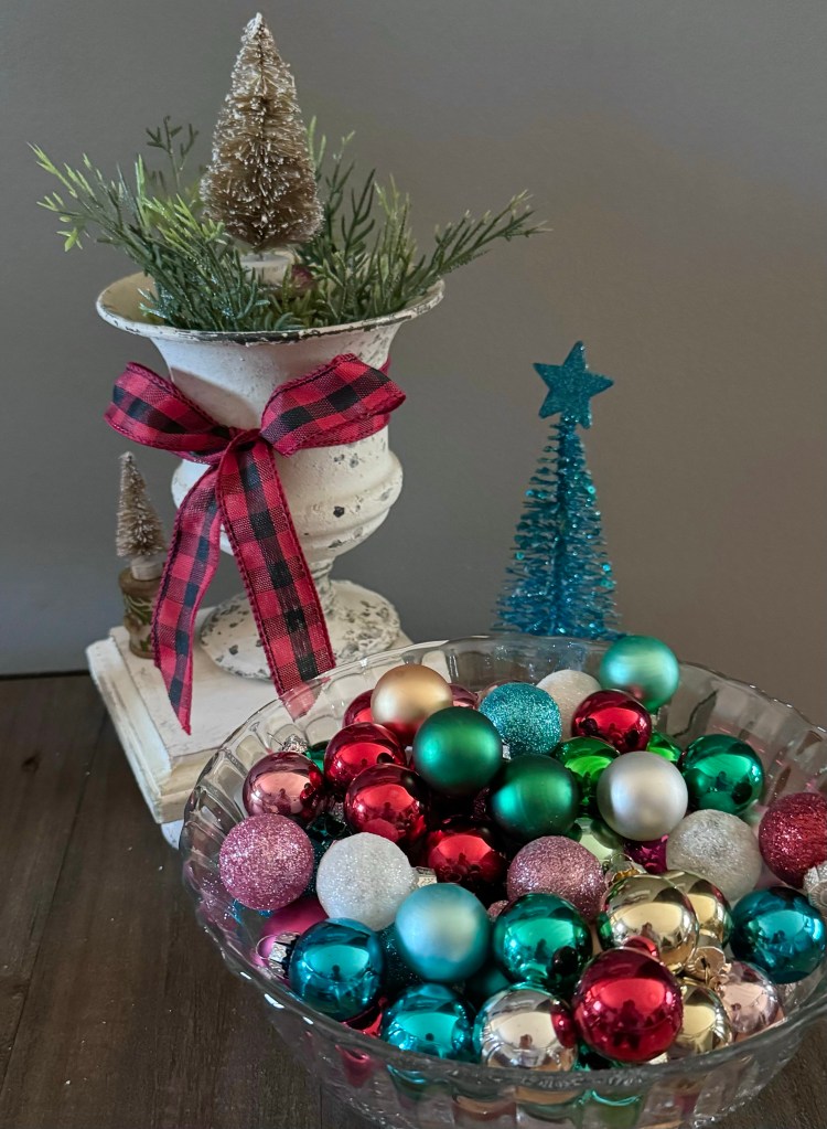 I found these vintage look ornaments on one of our trips. I added them to a pretty glass bowl and set them on my entry table next to my berry wreath and Farmhouse Yarn Wrapped Christmas Trees. Such a quick and easy way to add some Christmas cheer!
